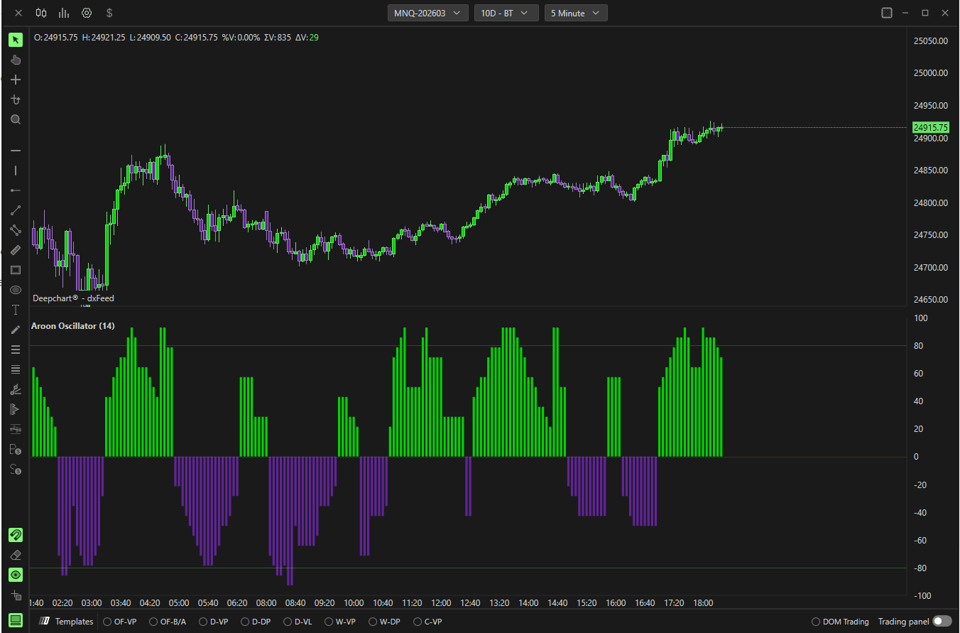 The Aroon Oscillator measures trend strength and direction by calculating the difference between Aroon Up and Aroon Down.