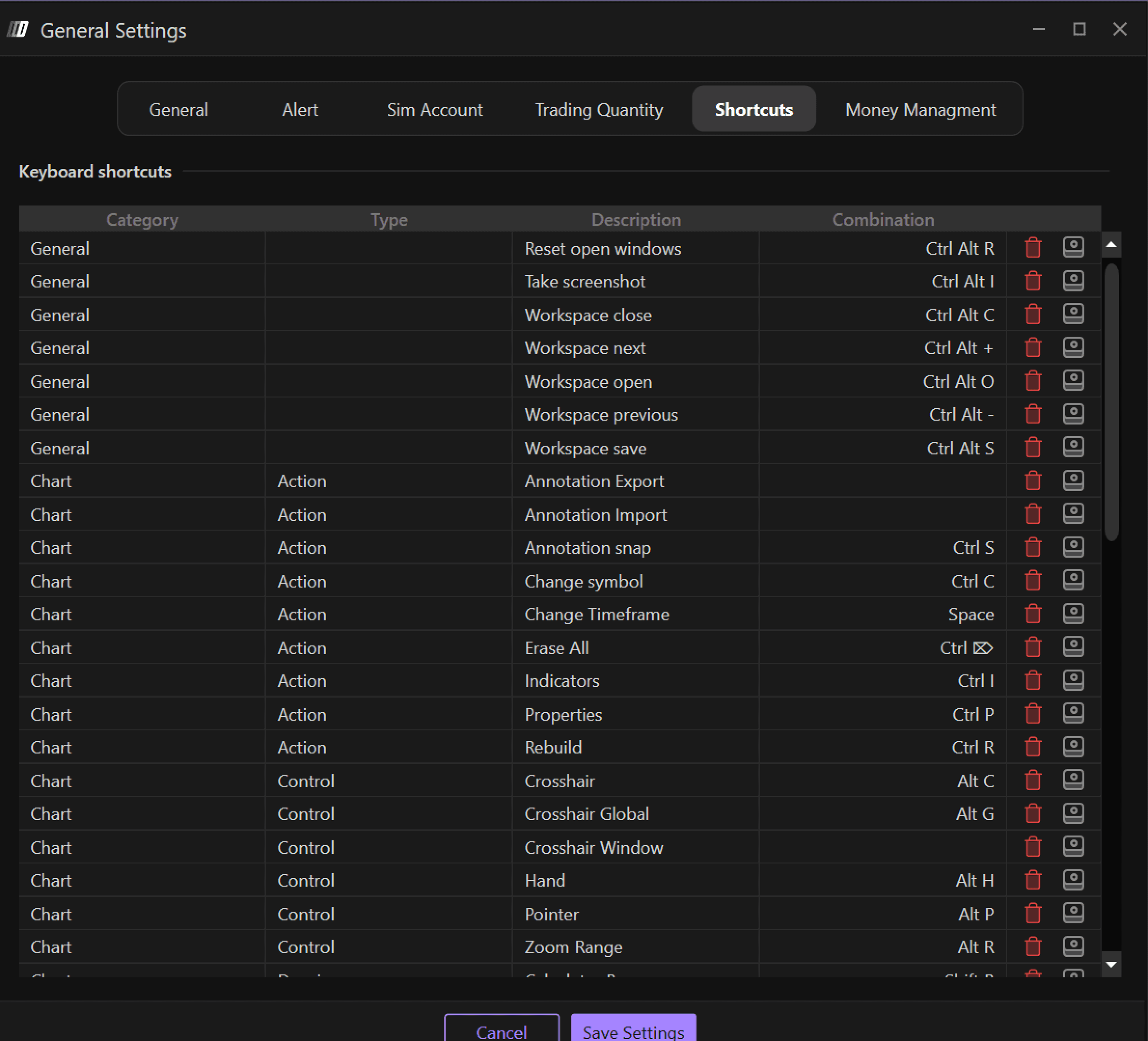 From this window you can configure various keyboard shortcuts to simplify and speed up the use of the platform.