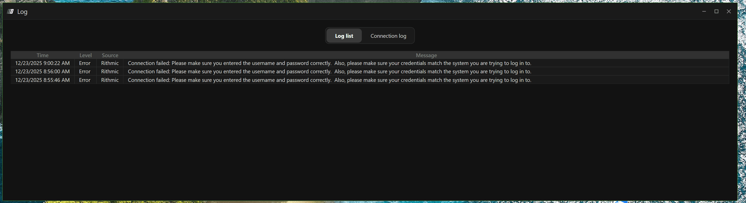 If the username or password is entered incorrectly, Rithmic will reject the connection.