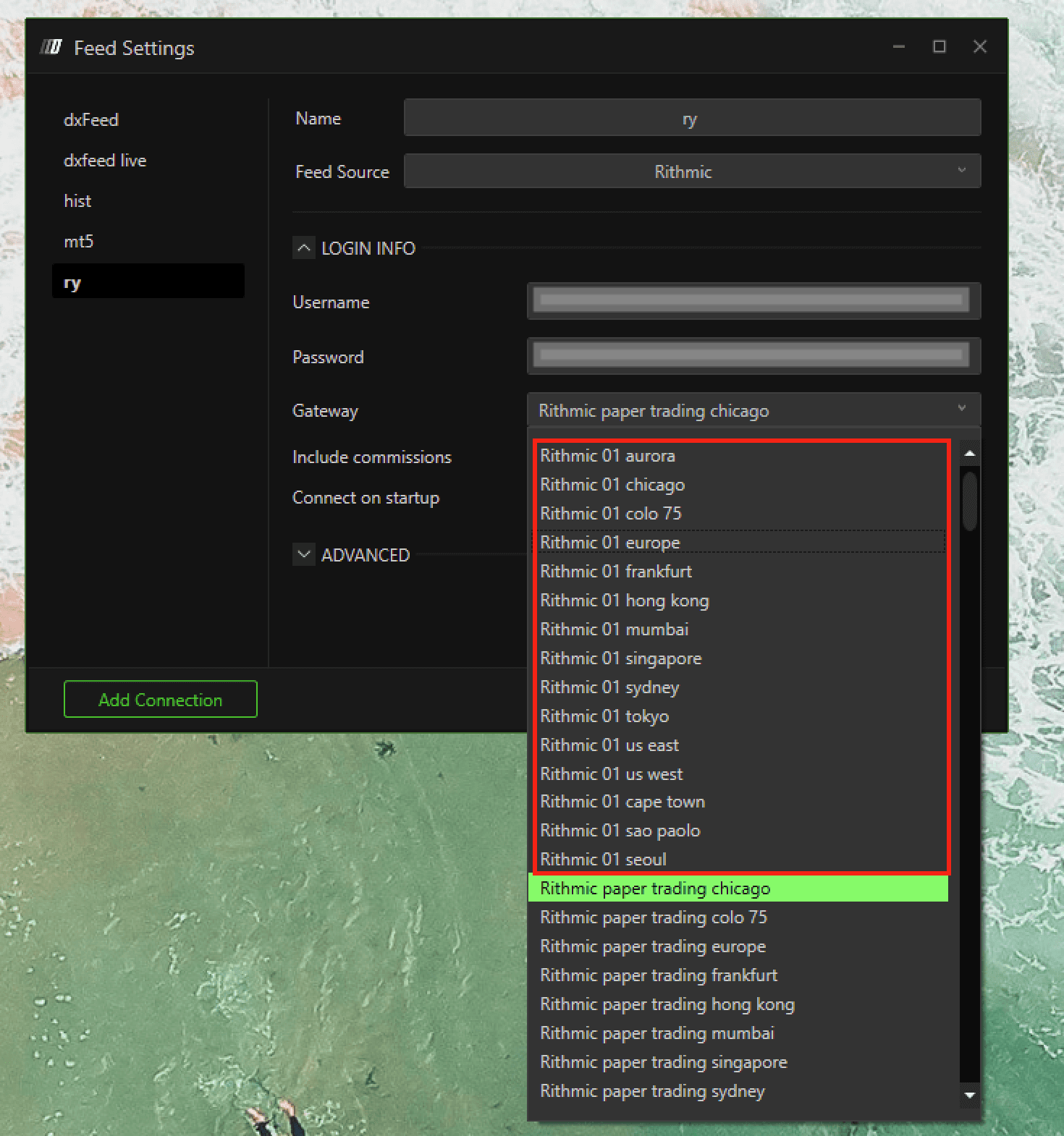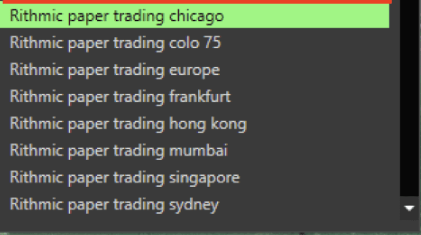 Rithmic Paper Trading GatewaySelect the Paper Trading Gateway and connect