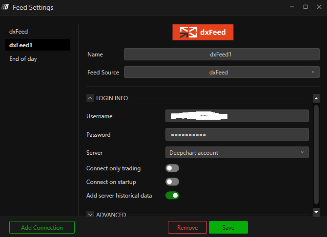 Enter the username and the password you have received in the Data Feed in my.deepcharts.com