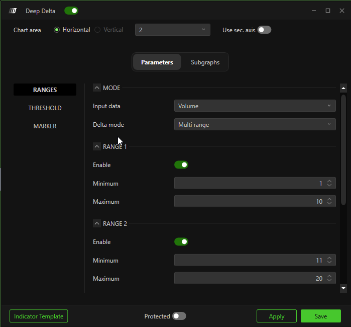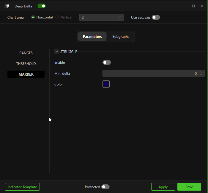 Enables marker verticals when both the minimum and maximum deltas reach a certain threshold set by the user, so as to highlight those situations when, in the same bar, there is a push in one side that is absorbed by leaving a shadow out of the indicator and then recording a delta push in the opposite side, or when the middle/low range records a delta push in one side and the high range in the other side.