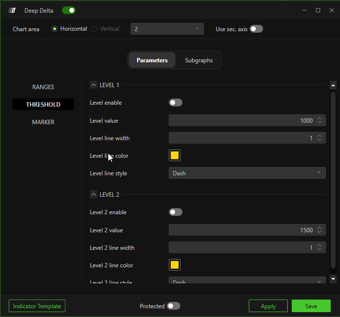 Lets you enable up to two horizontal lines, customizable in terms of color and style, at certain positive and negative delta levels. The user will thus be able to easily identify delta pushes that exceed certain thresholds he or she defines.