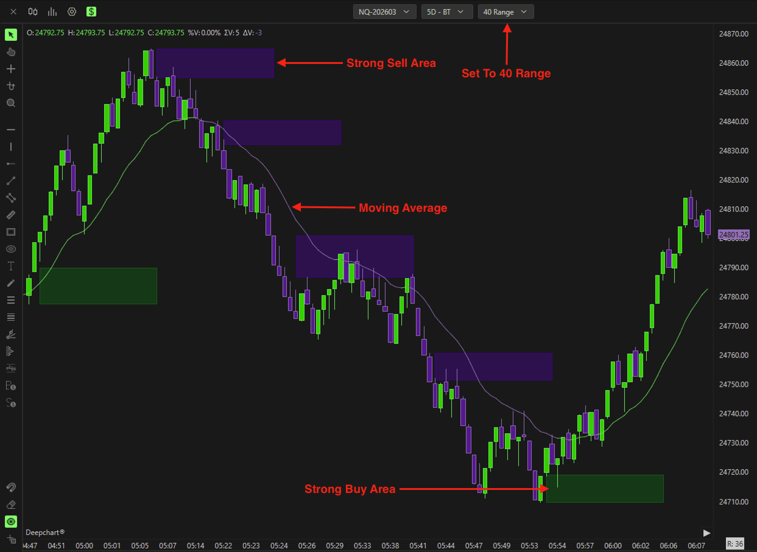 It is specifically designed to work on a 40 Range chart and highlights the path of least resistance in the order book.