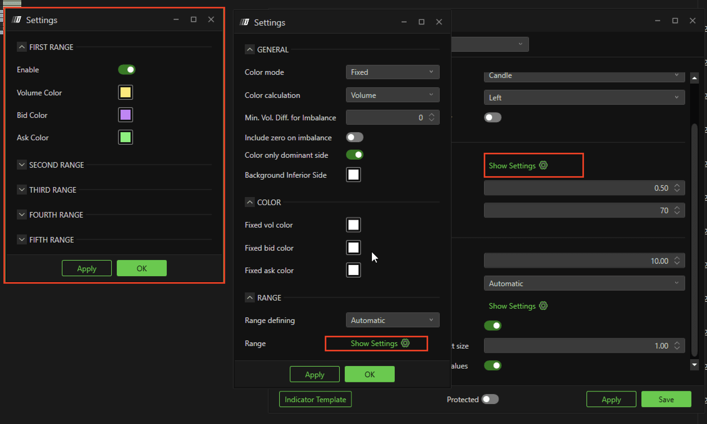 This section allows you to customize the coloration and visual representation of the footprint data for better interpretation of the volume delta, and market imbalances. Through different coloring modes and adjustment options, you can tailor the visualization to your preferences to facilitate orderflow analysis and quickly identify key areas of activity.