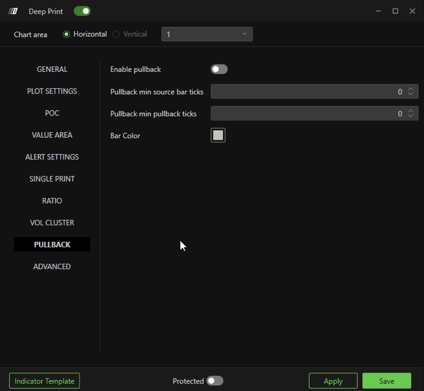Toggle pullback on or off on the footprint. This option allows the footprint to highlight price pullbacks, which are useful for understanding potential scalping operation points or intra bar entries and exits.