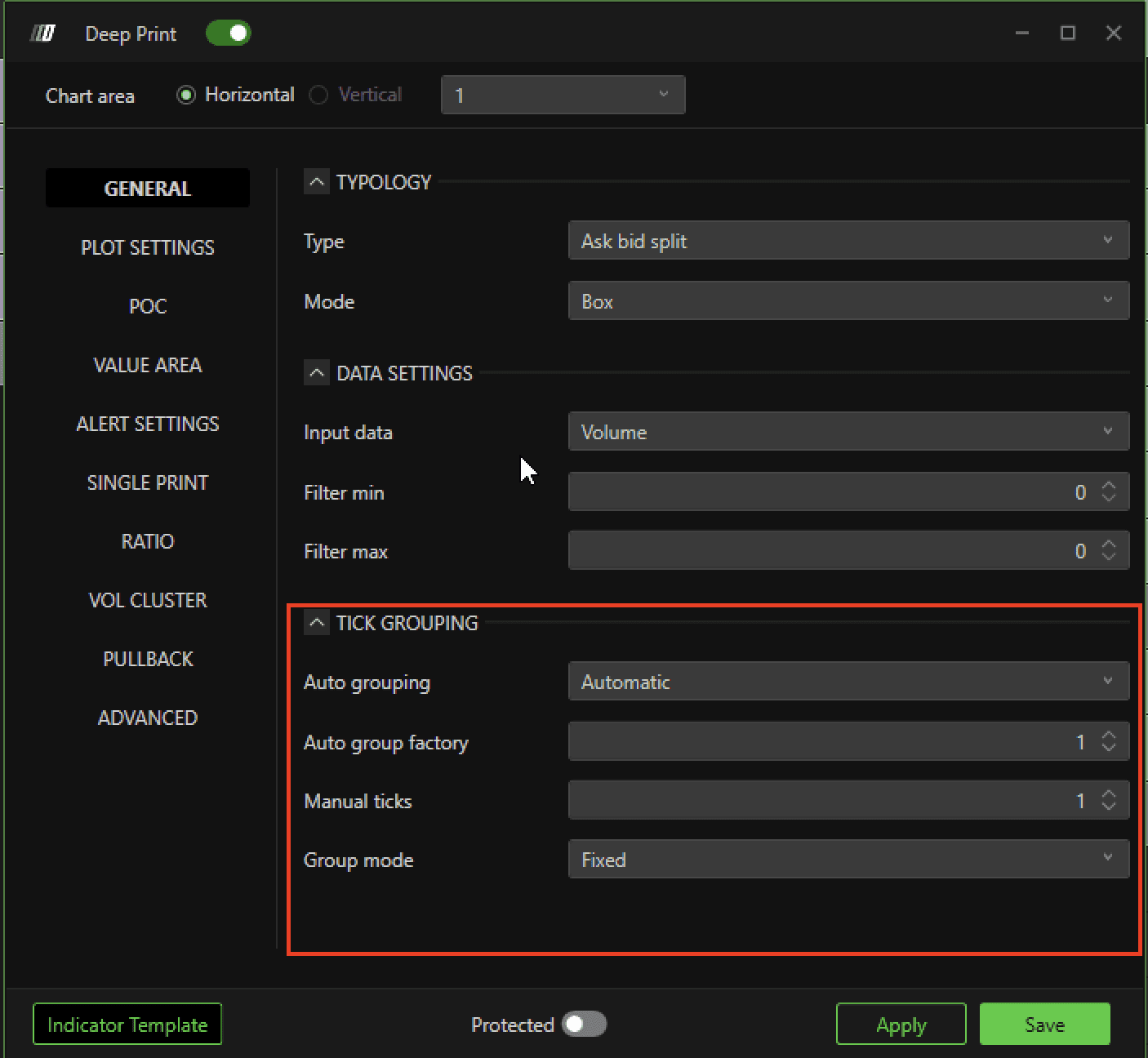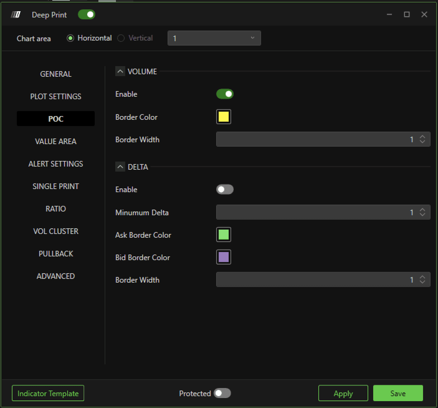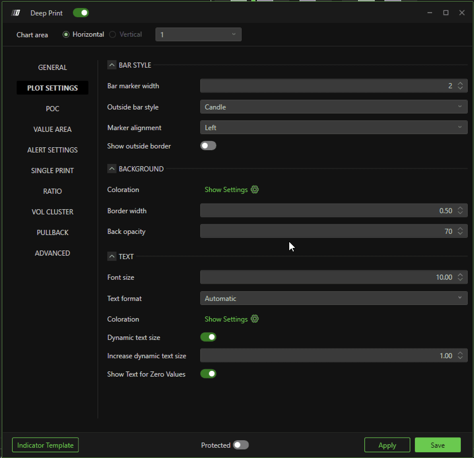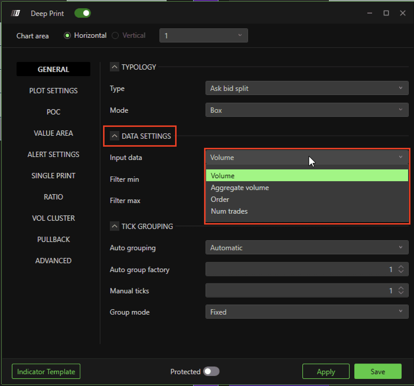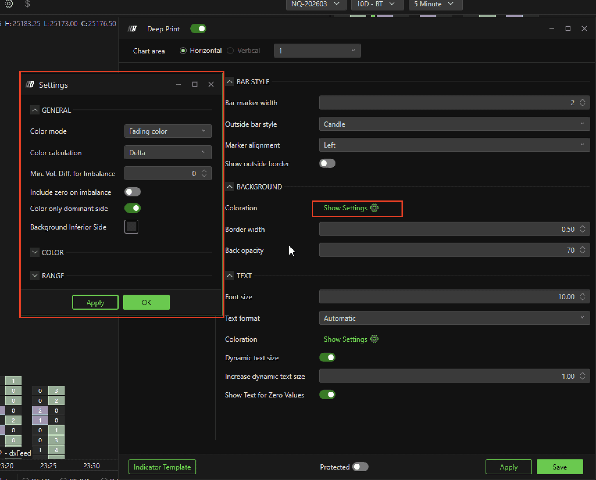 Coloration: This section allows the user to customize the coloring and numerical representation of the footprint data for better interpretation of volume, delta, and market imbalances. Through different coloring modes and adjustment options, you can tailor the visualization to your preferences to facilitate orderflow analysis and quickly identify key areas of activity.