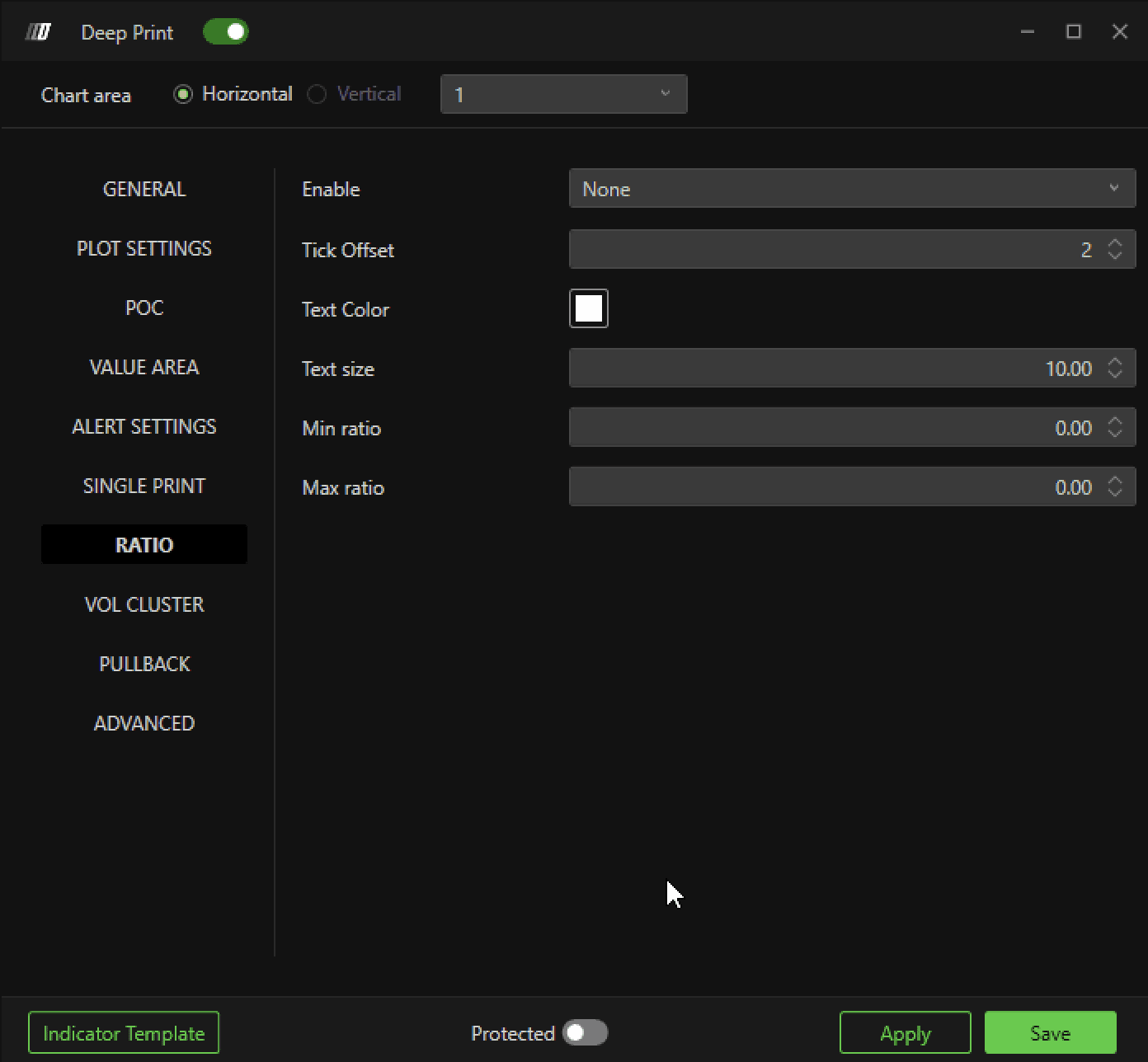 Enables or disables the display of the ratio on the footprint bar. When enabled, it provides a numerical representation of the bid/ask ratio directly on the chart.