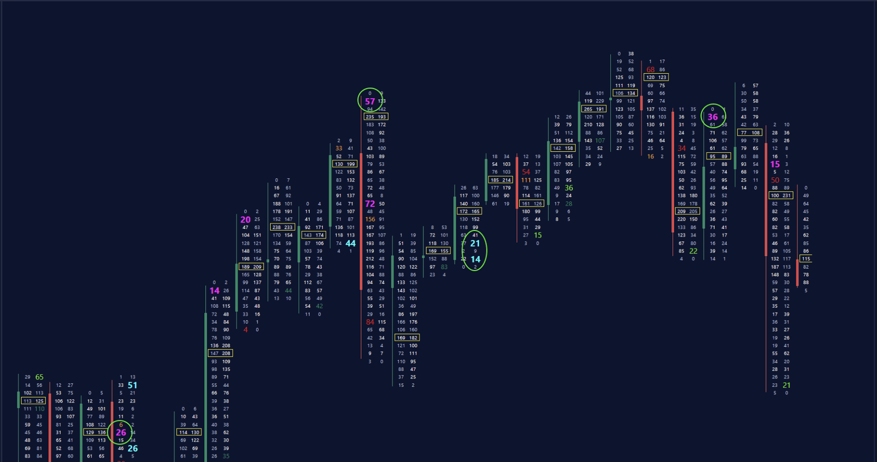 Dynamic Text Size: Automatically adjusts the size of the text within the chart, adapting it based on the amount of volume, delta, or imbalance displayed. When large amounts are detected, the text size increases proportionally to visually highlight these significant areas. This dynamic behavior allows you to quickly recognize the points of greatest activity on the chart, improving readability and making critical information easier to spot during order flow analysis.