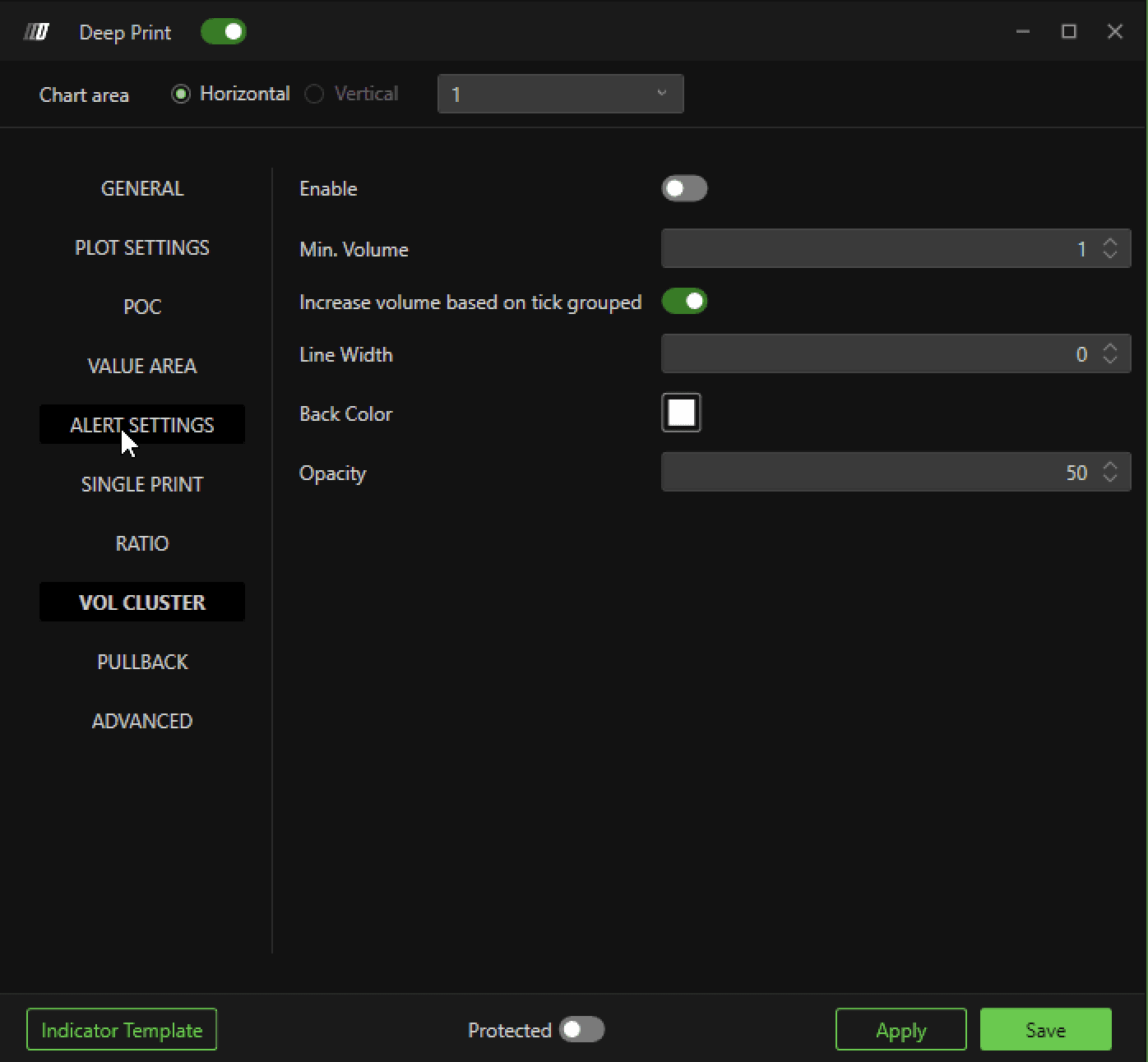 Enable or disable the display of the cluster volumes in the footprint. This feature highlights areas of the footprint with high trading volumes, helping to identify areas of strong market activity.