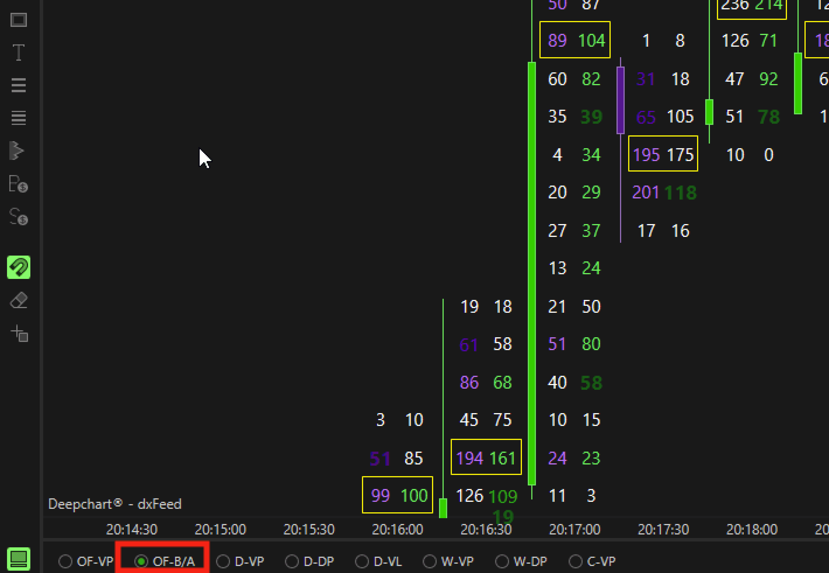 When activated, it colors only the side that has the dominant volume (e.g., if the bids are greater than the asks, only the bids will be colored). This helps to focus only on the most significant part of the order flow.