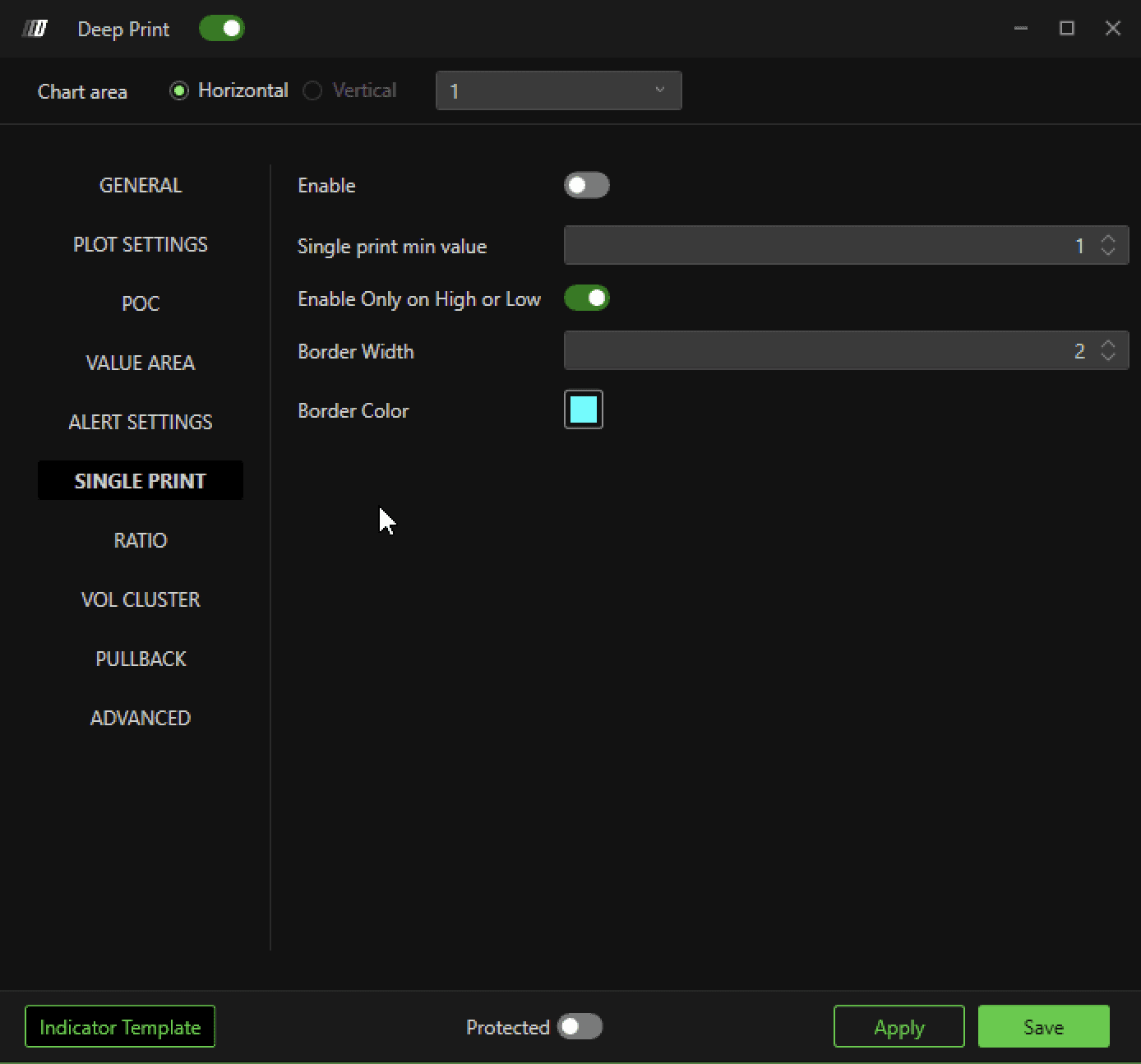 Enable or disable the display of single prints on the footprint. When enabled, this feature allows specific price levels characterized by a single defined order to be highlighted.