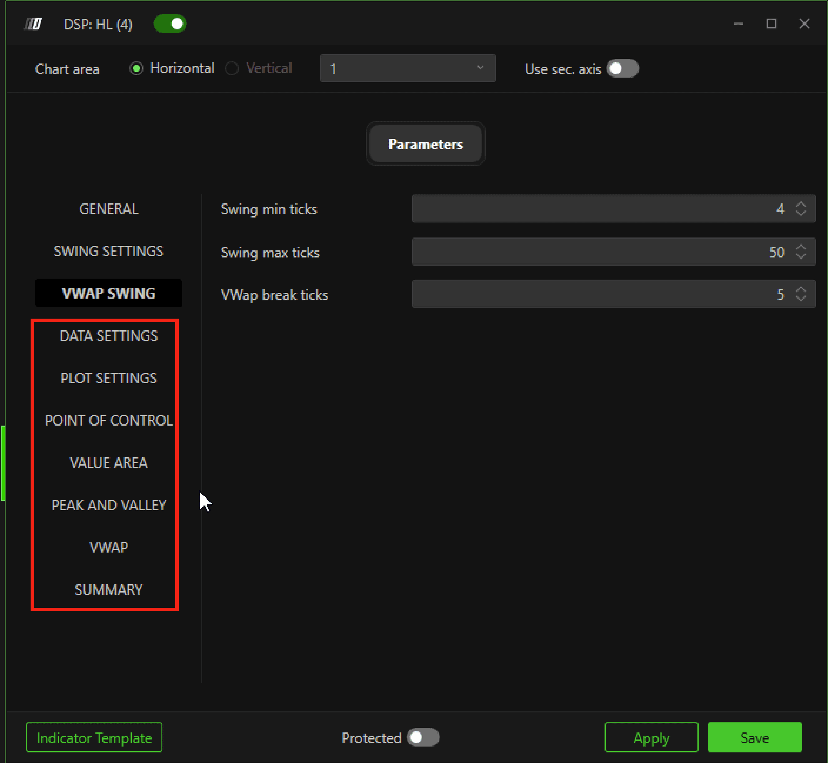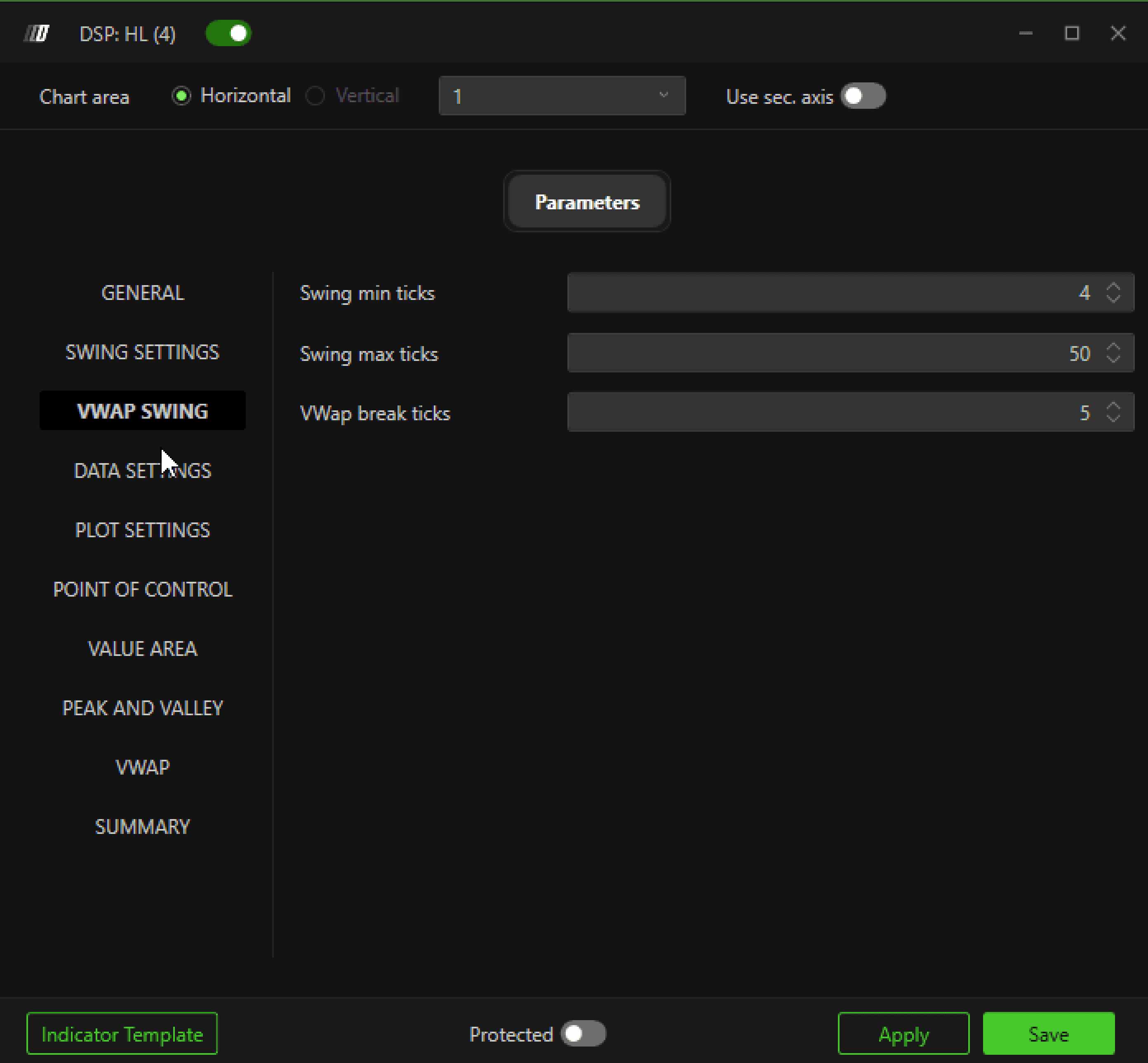 These settings allow you to customize the length and dynamics of the swing when the VWAP parameter is used as the setting of parameter 2. Type of Length, of the General section of this indicator.