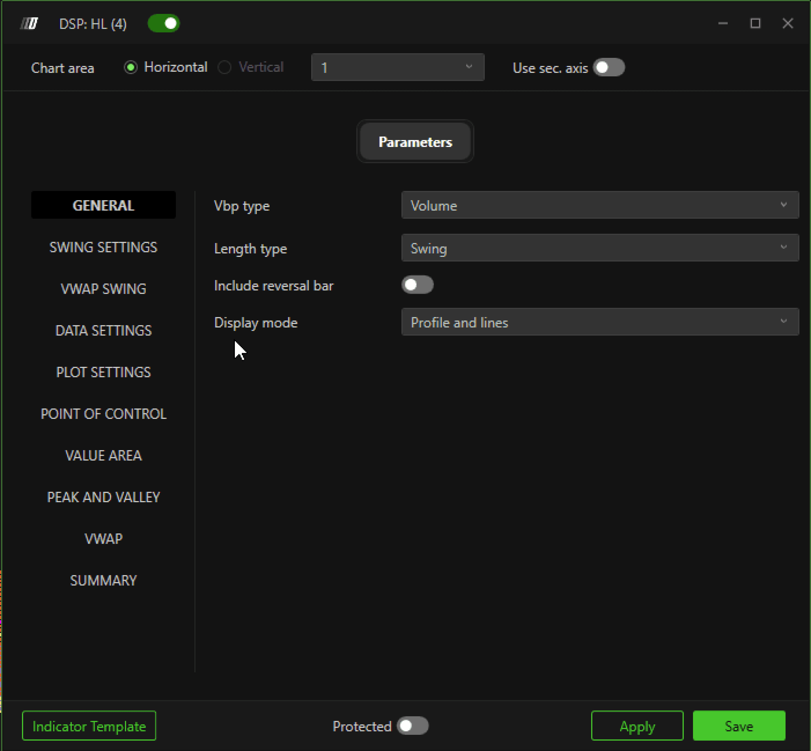 VWAP: If VWAP is selected as the length type, the Volume Profile is calculated taking into account the VWAP (Volume Weighted Average Price) within the swing.