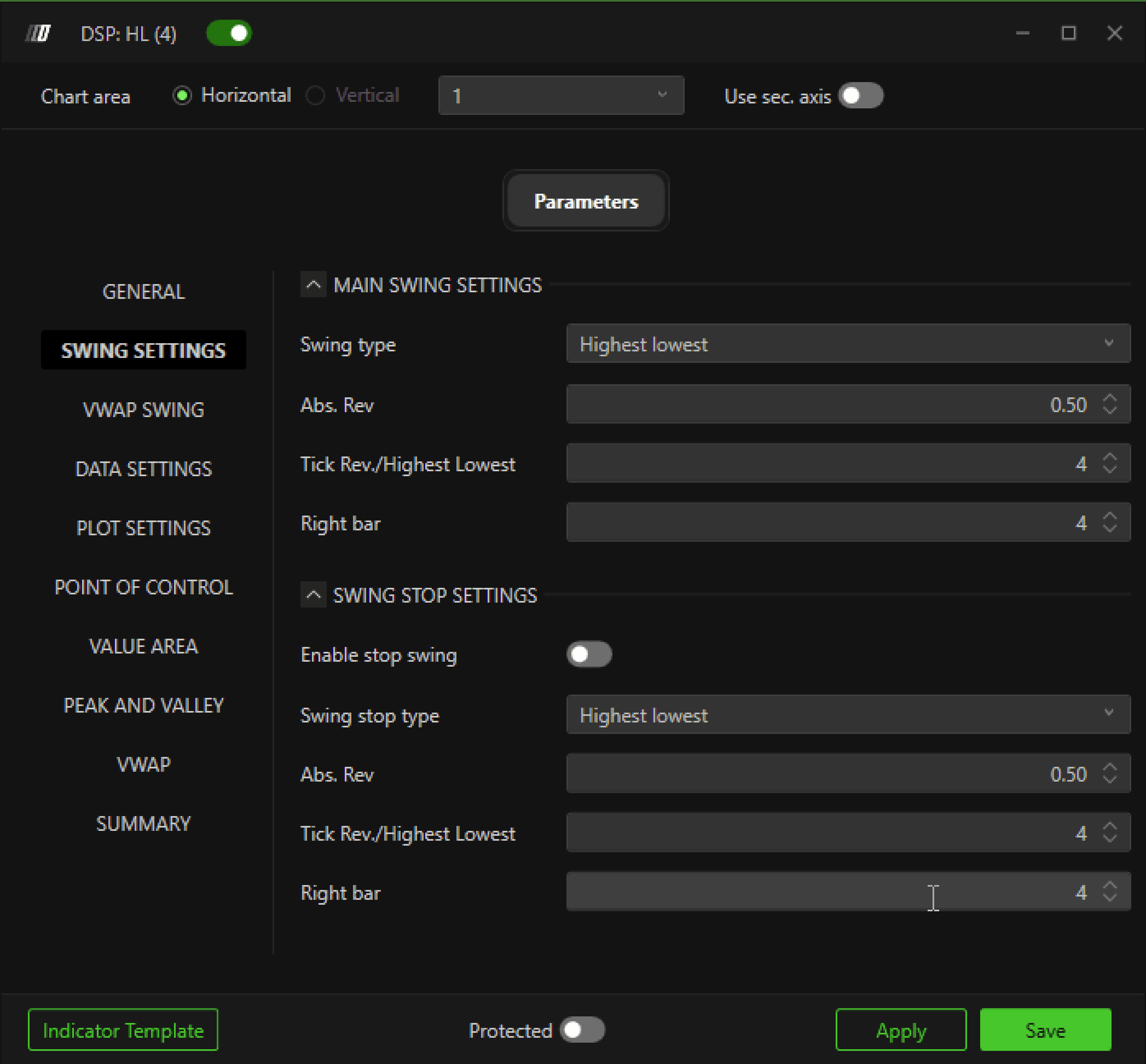 The parameters of the Swing Stop Settings are identical to those of the Main Swing Settings. The goal is to apply similar criteria to identify the end of a current swing, but with a separate flexibility to control it, thus defining the swing stop criteria.