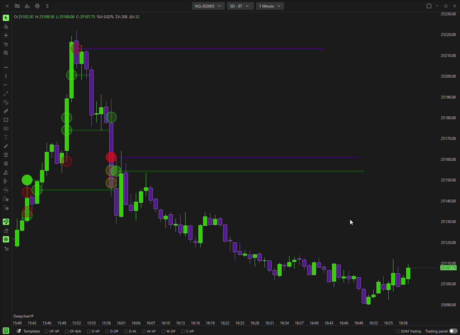 The Deep Trades indicator allows traders to visualize large, aggressive market orders in real time. It highlights significant buy and sell activity directly on the chart, helping identify institutional participation and strong directional intent.