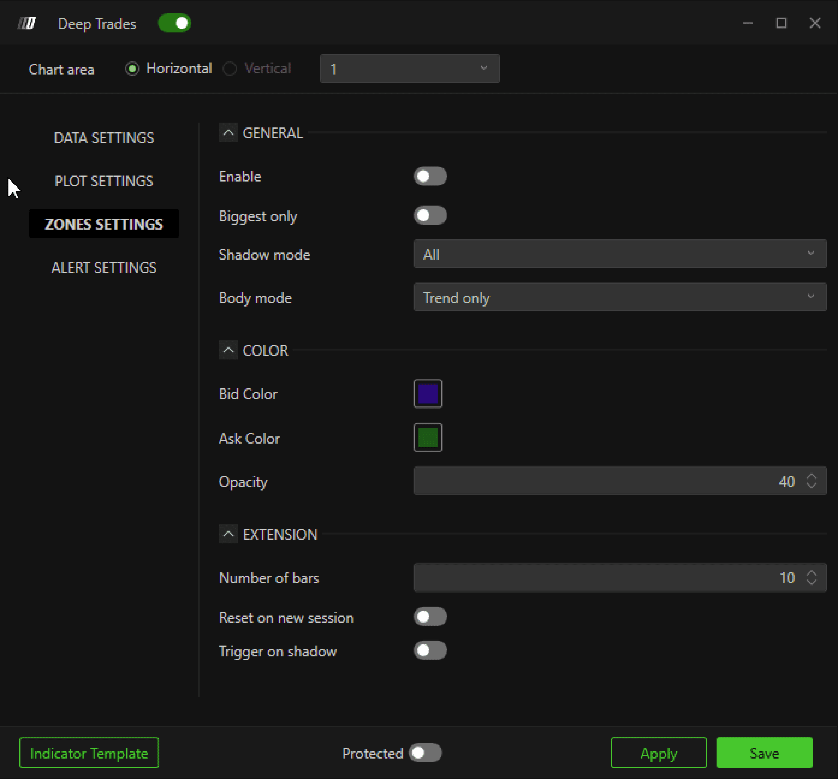 When enabled, the indicator plots horizontal zones based on large trades.