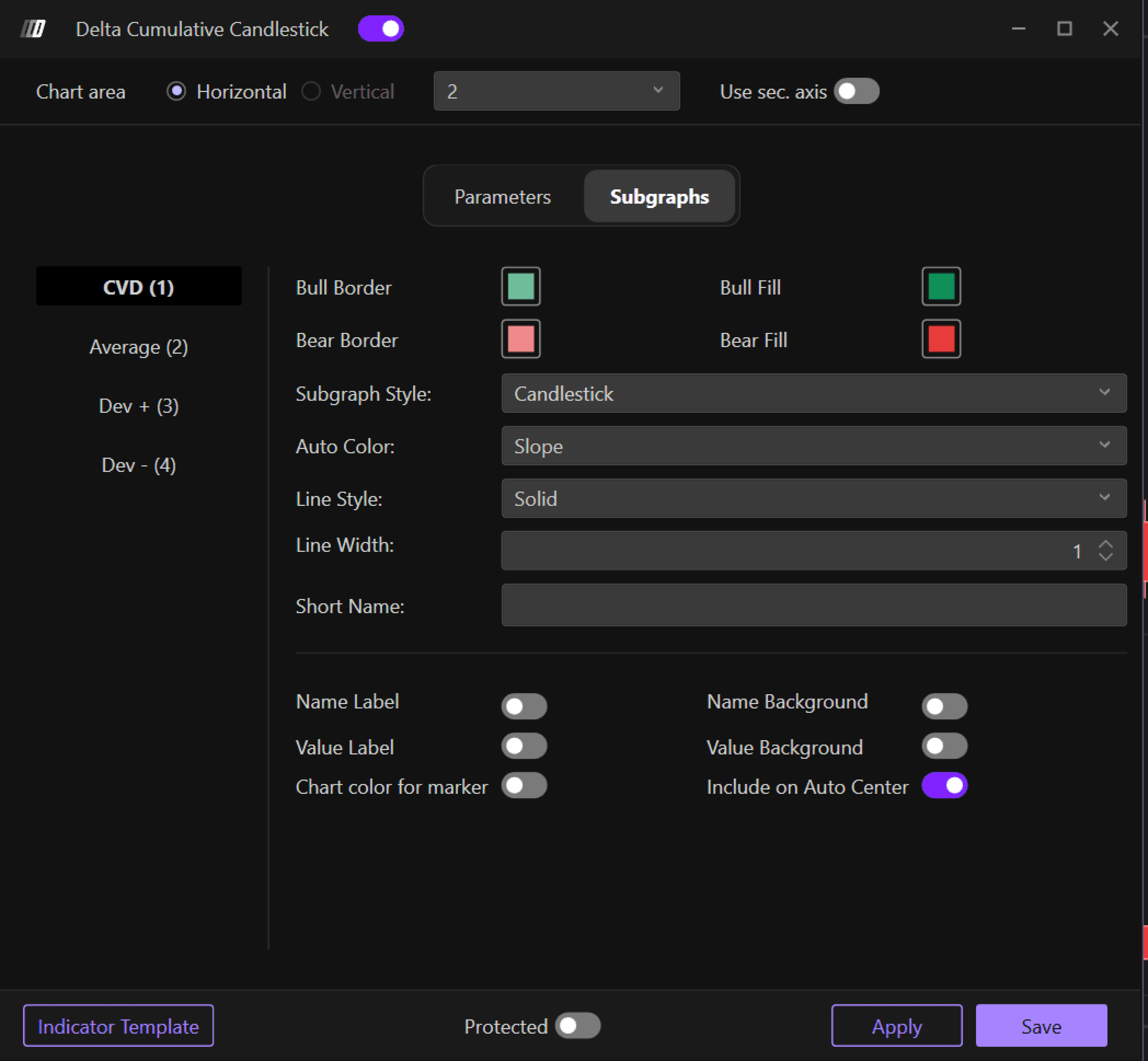 Colors: Define the color scheme for the cumulative delta candlesticks (typically different colors for positive vs negative delta)