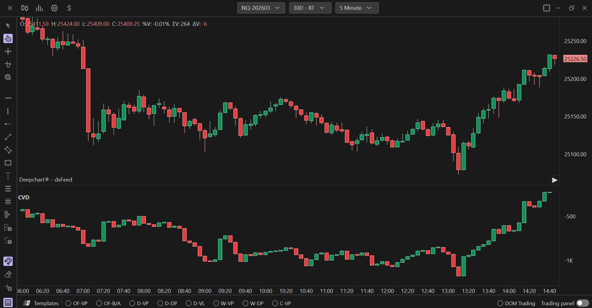 The Delta Cumulative Candlestick indicator allows you to visualize through candlesticks at the footer of the chart the cumulative delta summation of each candlestick, that is, the difference between sell market and buy market. This allows users to identify which side of the market is more aggressive. Candlestick display may make it easier for some users to identify divergences between cumulative delta and price.