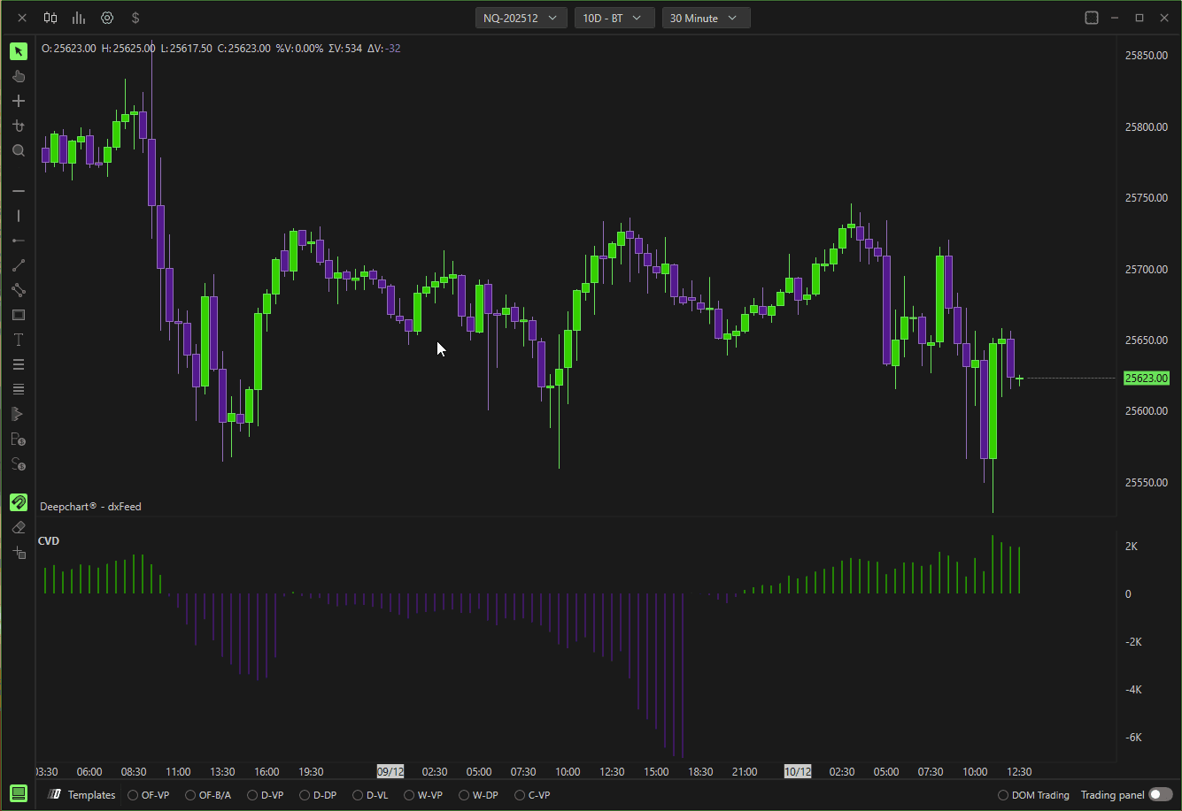 DeepChart Delta Cumulative Histogram indicator allows the user to visualize through bars or a line at the foot of the chart, the cumulative delta summation of each candle's delta, i.e., the difference between sell market and buy market, allowing the user to identify which side of the market is more aggressive.