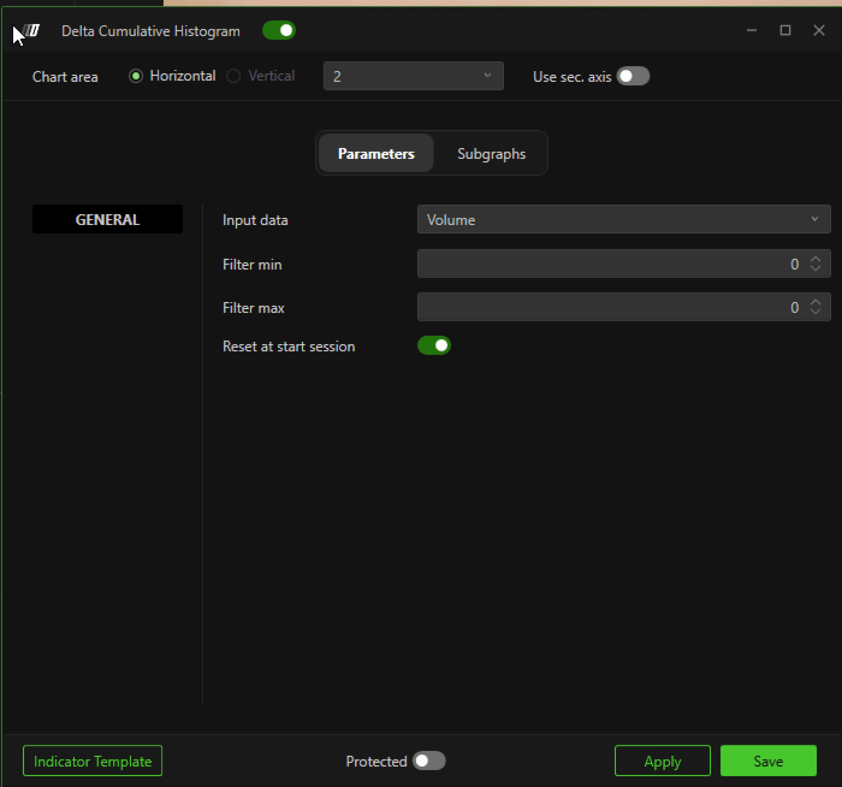 When enabled, the Delta Cumulative Histogram resets at the start of each trading session, rather than continuing indefinitely across sessions.