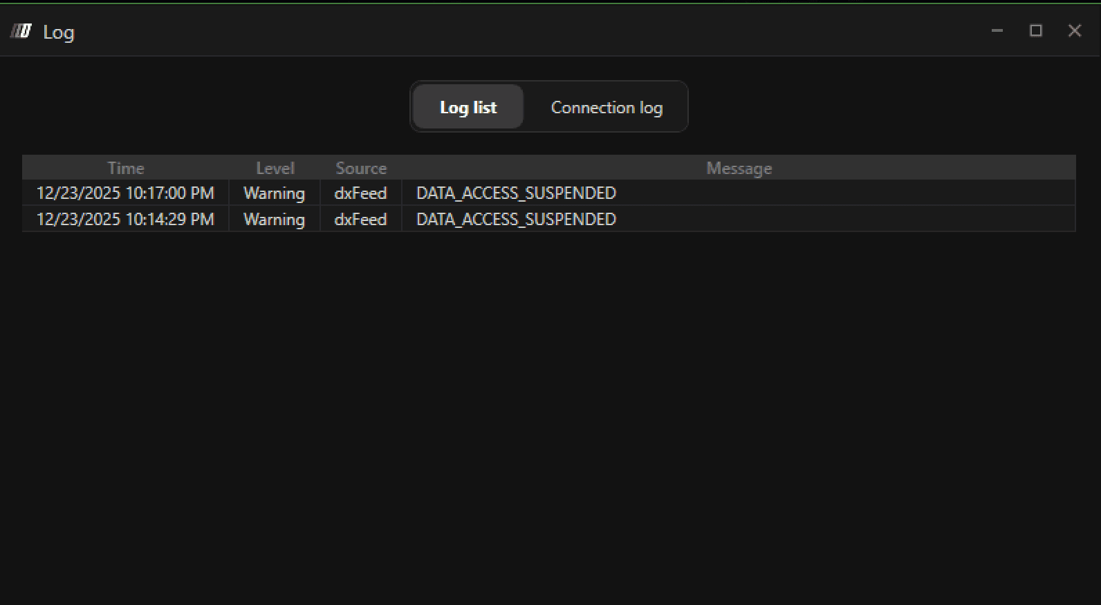 The DATA_ACCESS_SUSPENDED error appears when DXFeed suspends market data access due to a mismatch in your Non-Professional status.