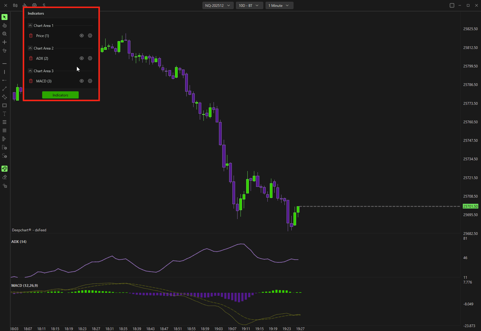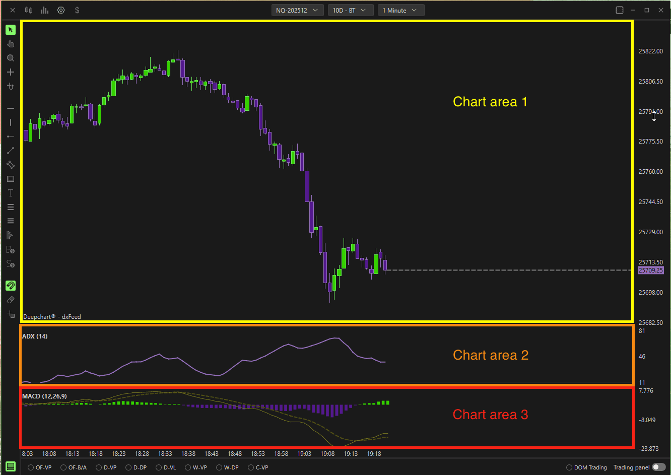For example, if you’re using two indicators — ADX and MACD, your window will be divided into three chart areas: