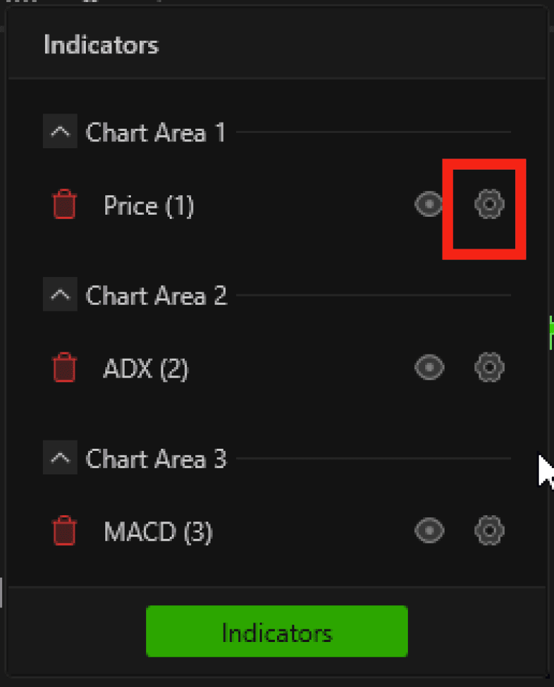 To change the chart area of any indicator and adjust the layout, open the indicator settings and select a different chart area, as demonstrated below.
