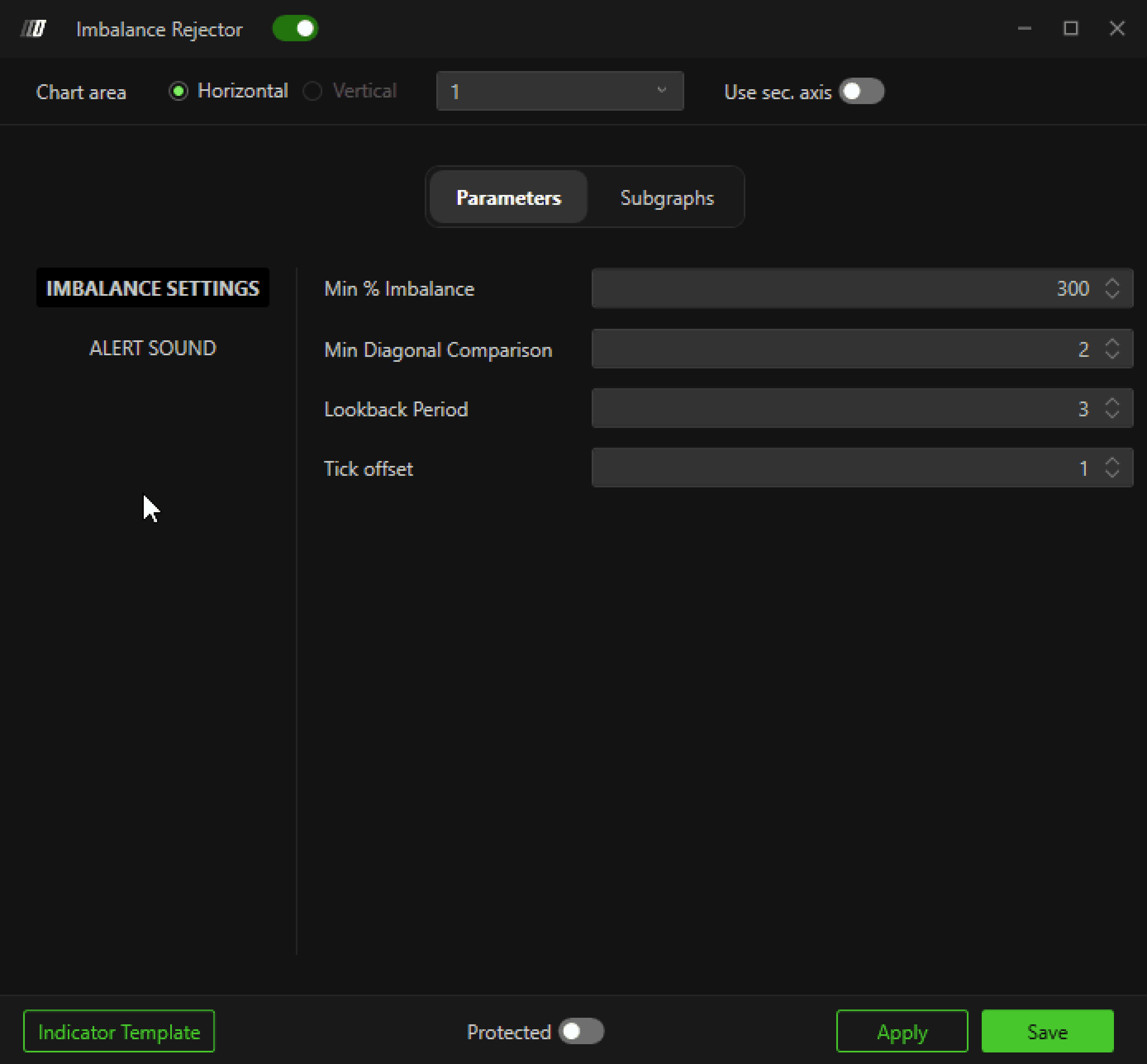 Defines the diagonal comparison minimum where to look for an imbalance. Specifically, if 1 is entered as a parameter, the indicator will search for imbalances by comparing the last tick in Ask with the second-to-last tick in Bid in bearish bars and the last tick in Bid with the second-to-last tick in Ask in bullish bars.