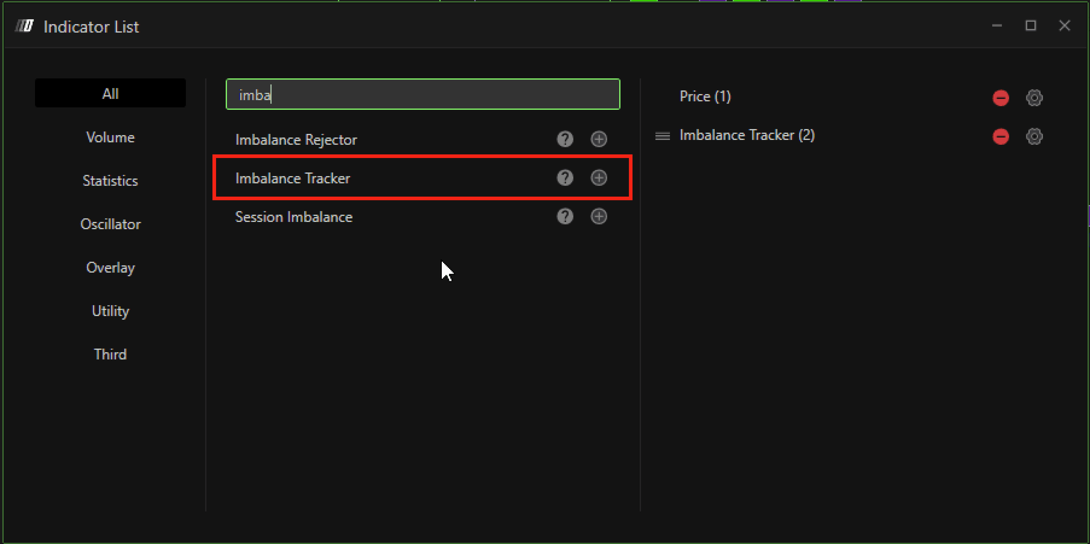 To apply the Imbalance Tracker indicator to the chart, click on the Indicators function, and select from the list Imbalance tracker.