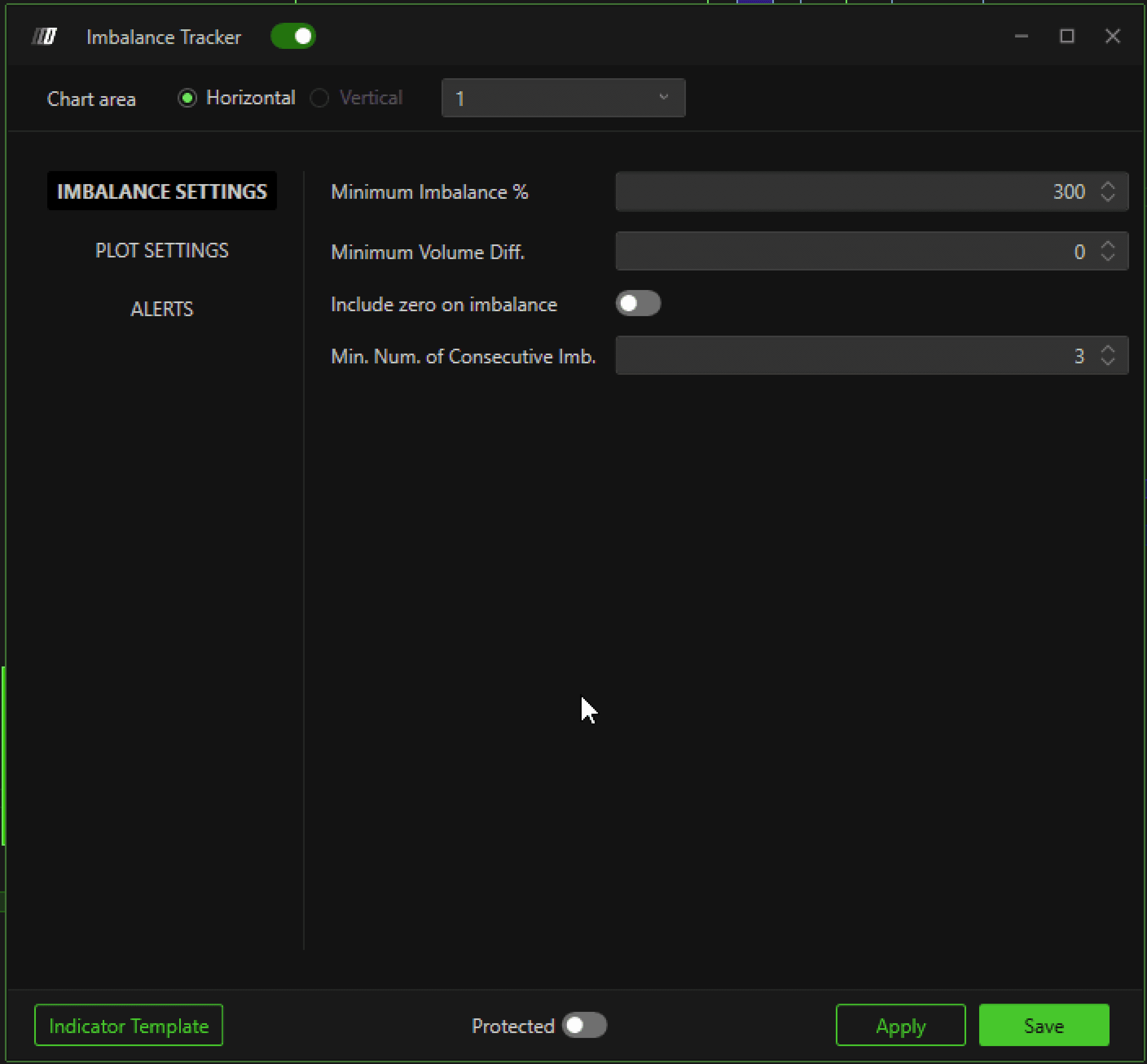 Minimum Volume Diff: Sets the minimum volume difference between the buy and sell side to detect imbalance. This setting is useful for excluding very small volumes.