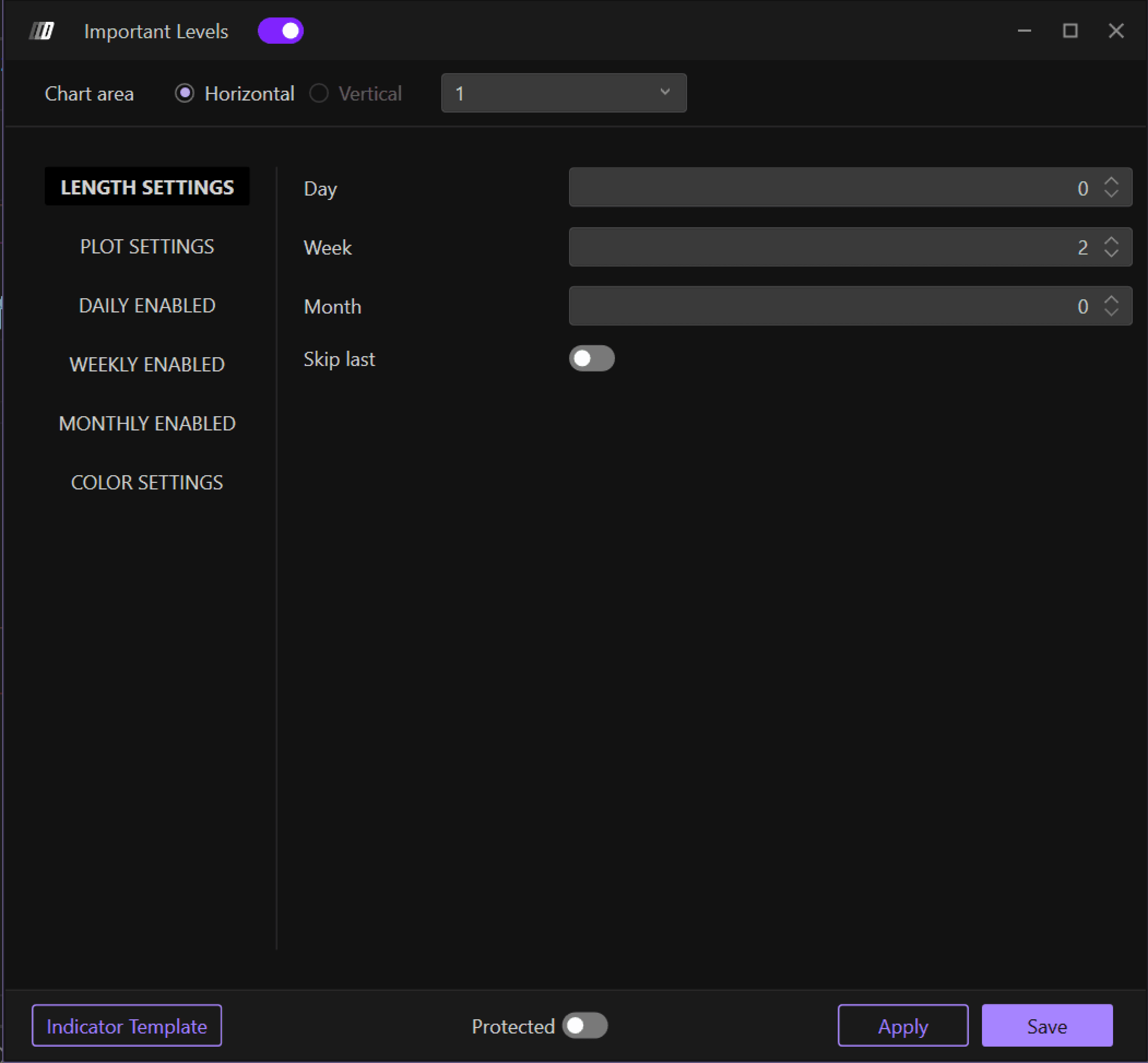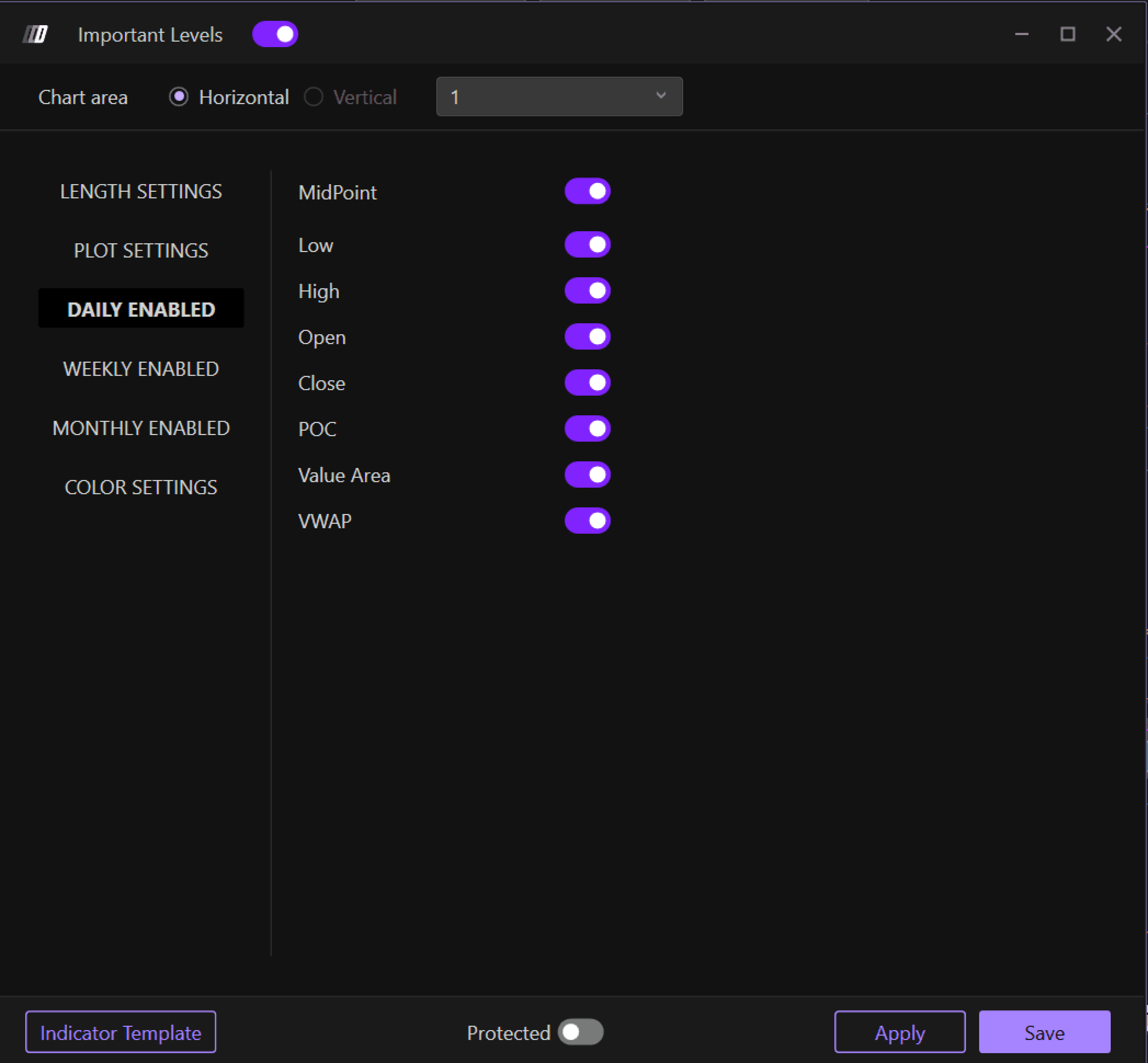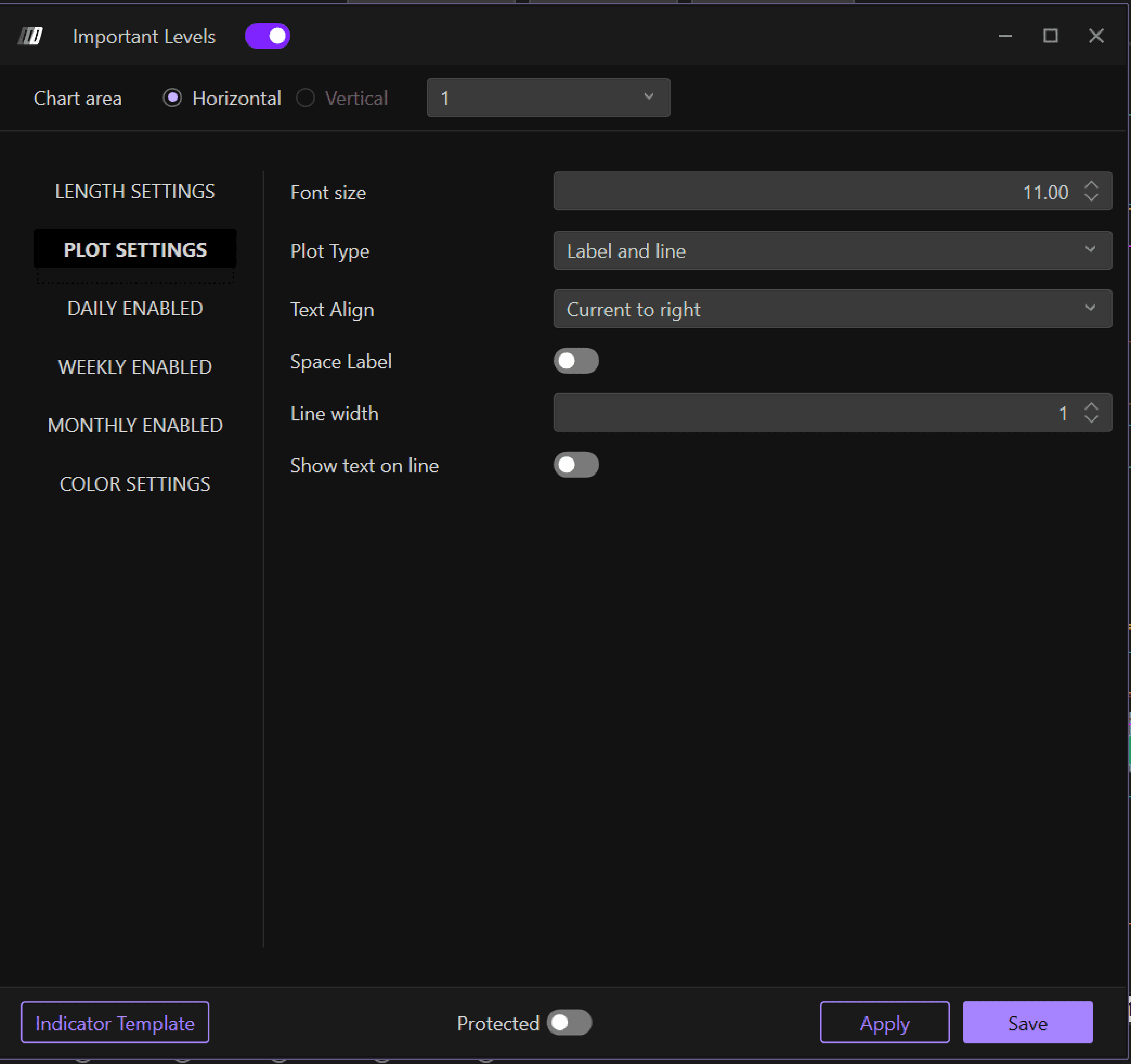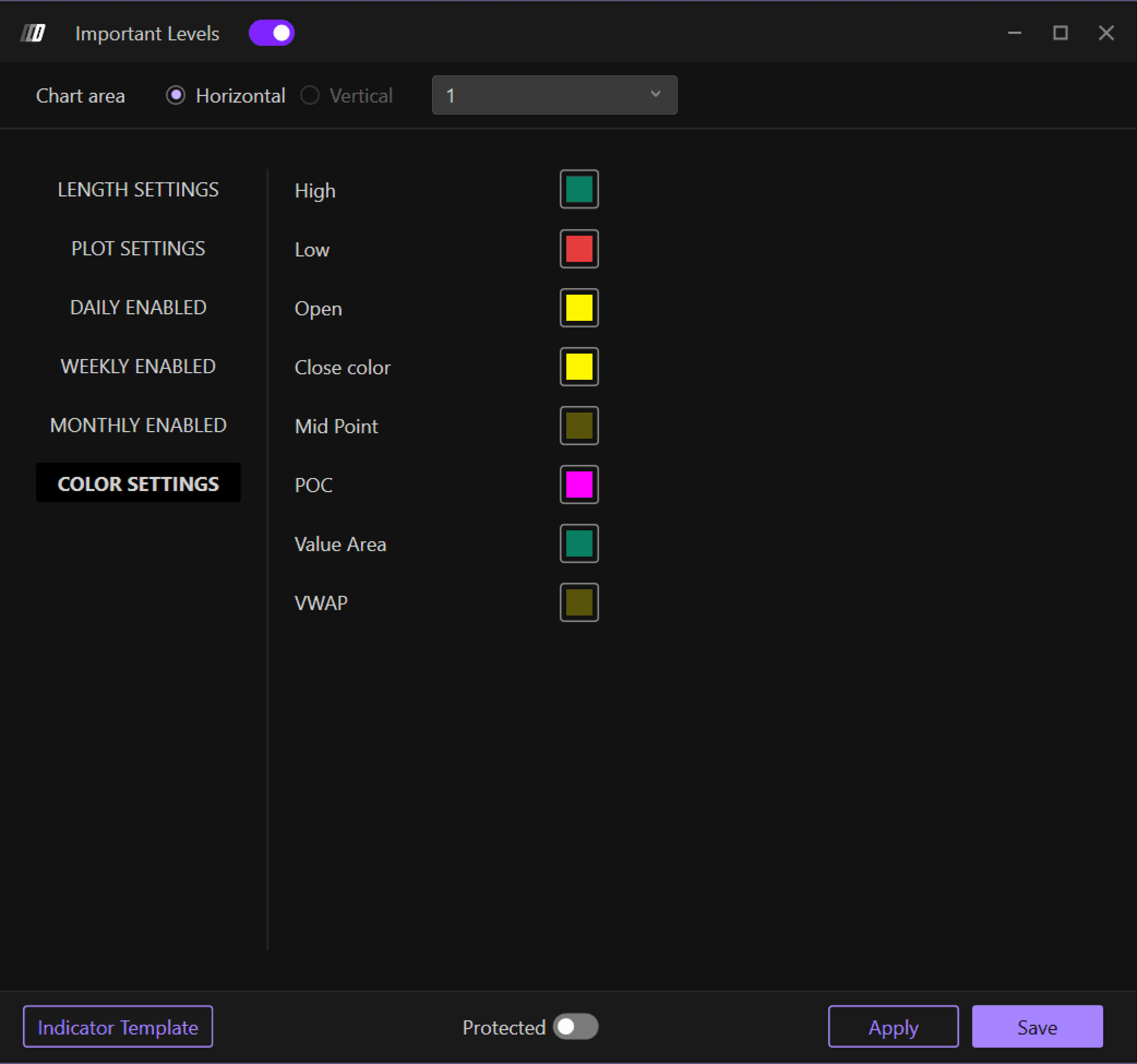 Tip: If you want to differentiate colors between daily, weekly, and monthly important values, you can insert multiple Important Levels indicators—for example, one with only daily values and one with only weekly values—and differentiate their colors.