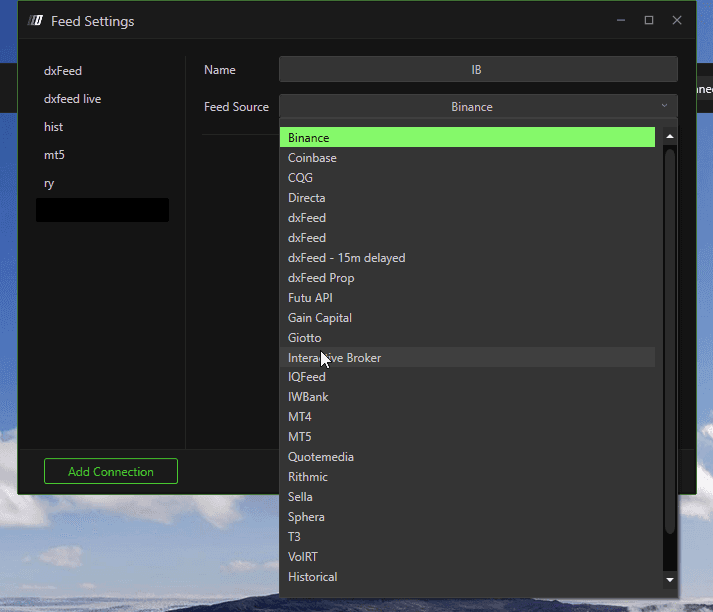 Charts will be built from dxFeed or Rithmic, while orders will be sent through Interactive Brokers.