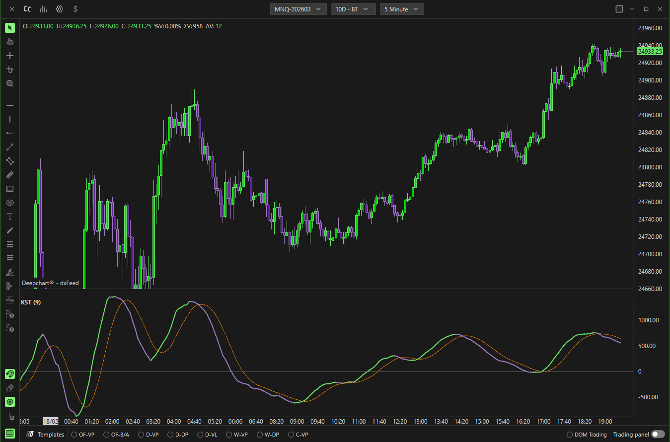 It combines short-, medium-, and long-term momentum into one indicator and includes a signal line for crossover analysis.