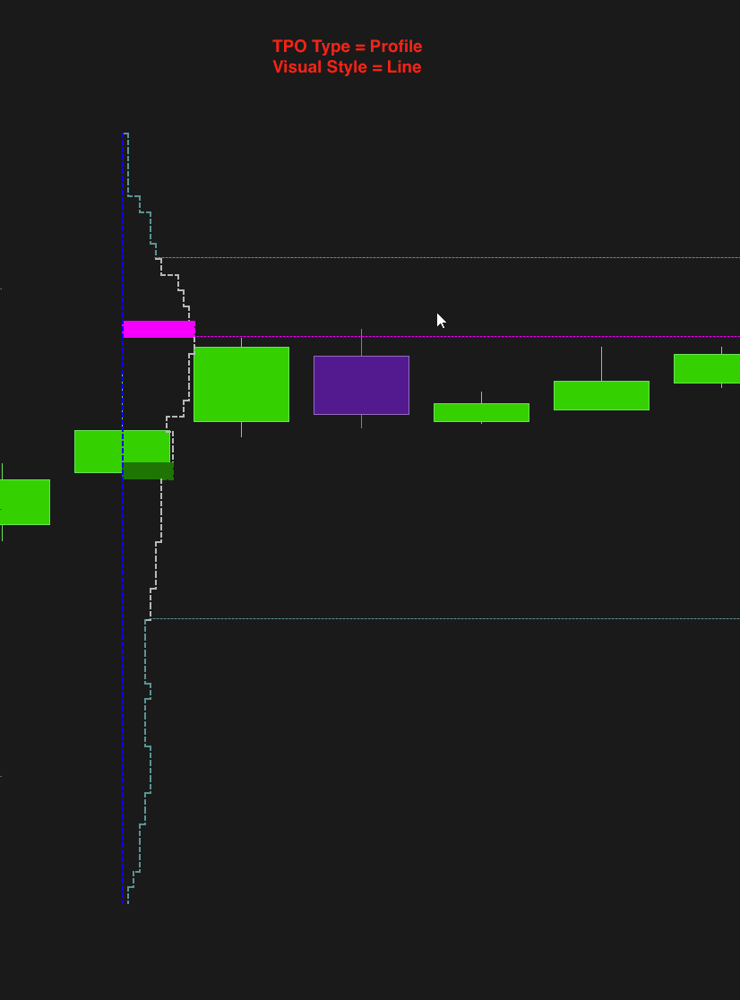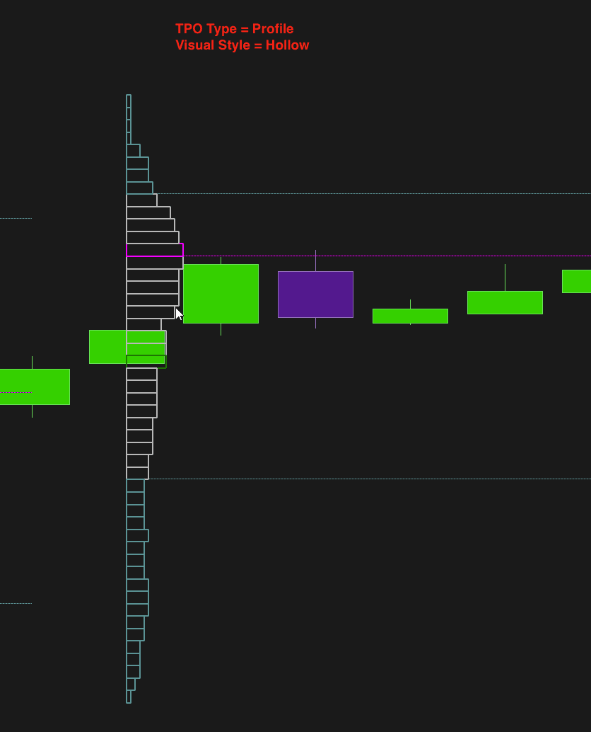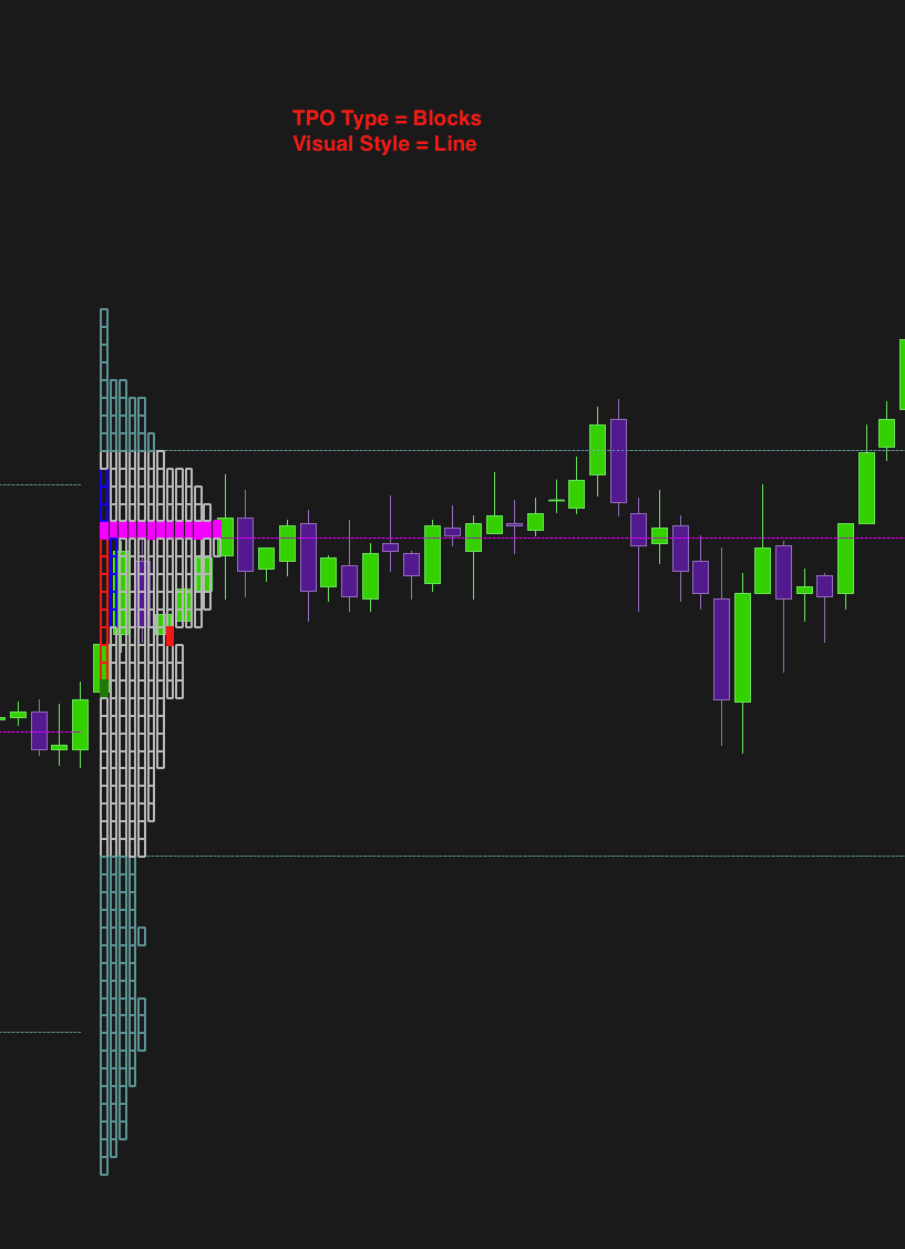 Show the TPO using outlines without fill. This style is lighter visually and (applies to TPO- Profile and BOX type)allows you to maintain a clean graphical appearance, making other indicators on the chart more visible.*(applies to the TPO- Profile and BOX type)*LineRepresents the volume profile using only an outline. This style minimizes the amount of graphical elements, ideal for those who prefer a less loaded but still informative graph of volumes traded. (Applies to TPO- Profile type)