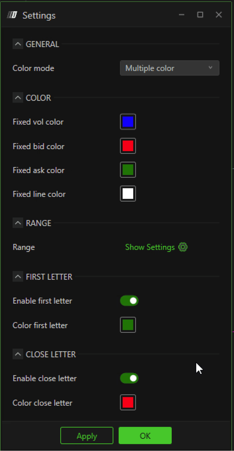 Ask Color: Defines the color for the volume of orders in ask (sell).