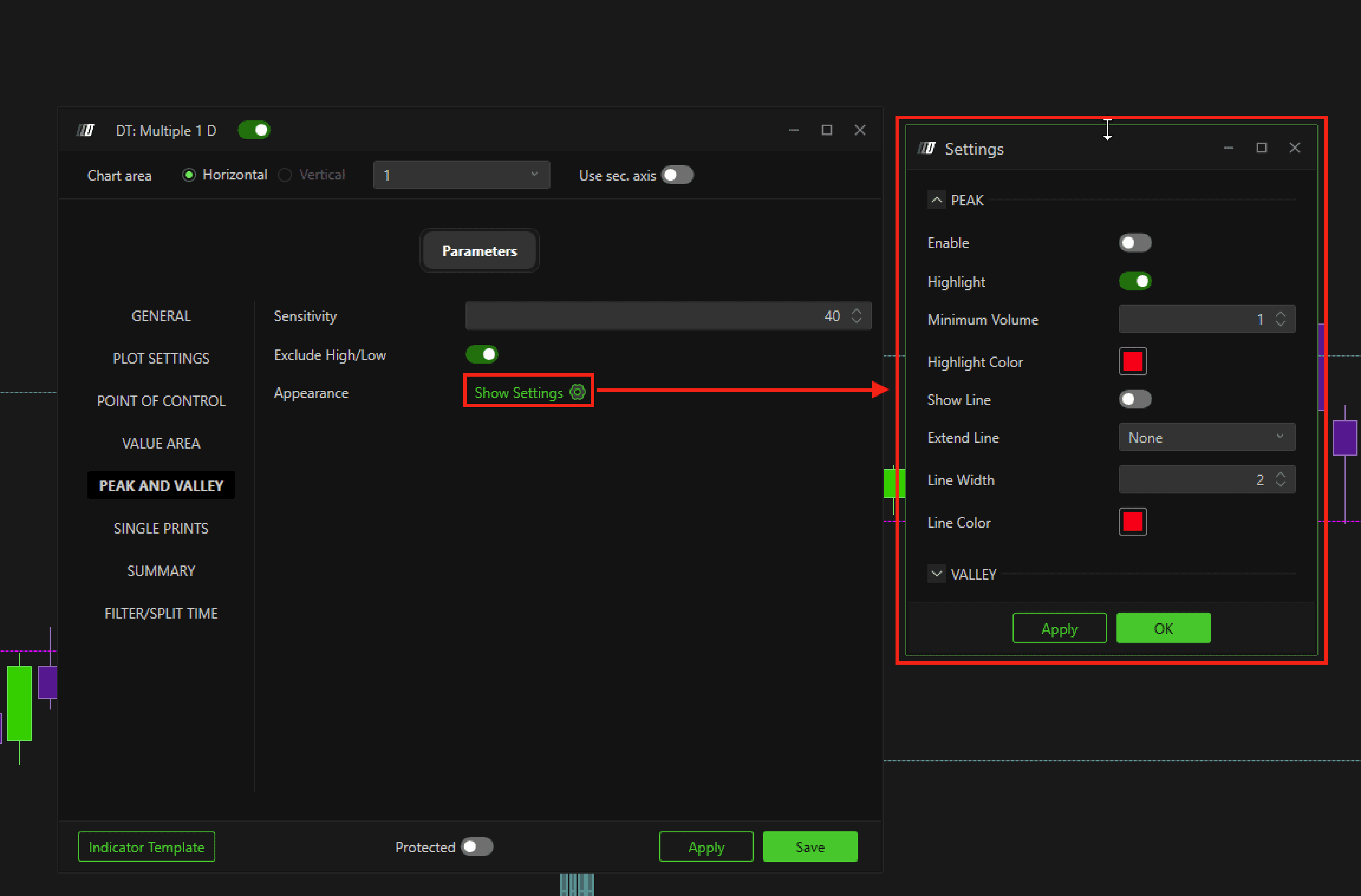 Extend Line: Defines whether to extend the Valley line along the chart.