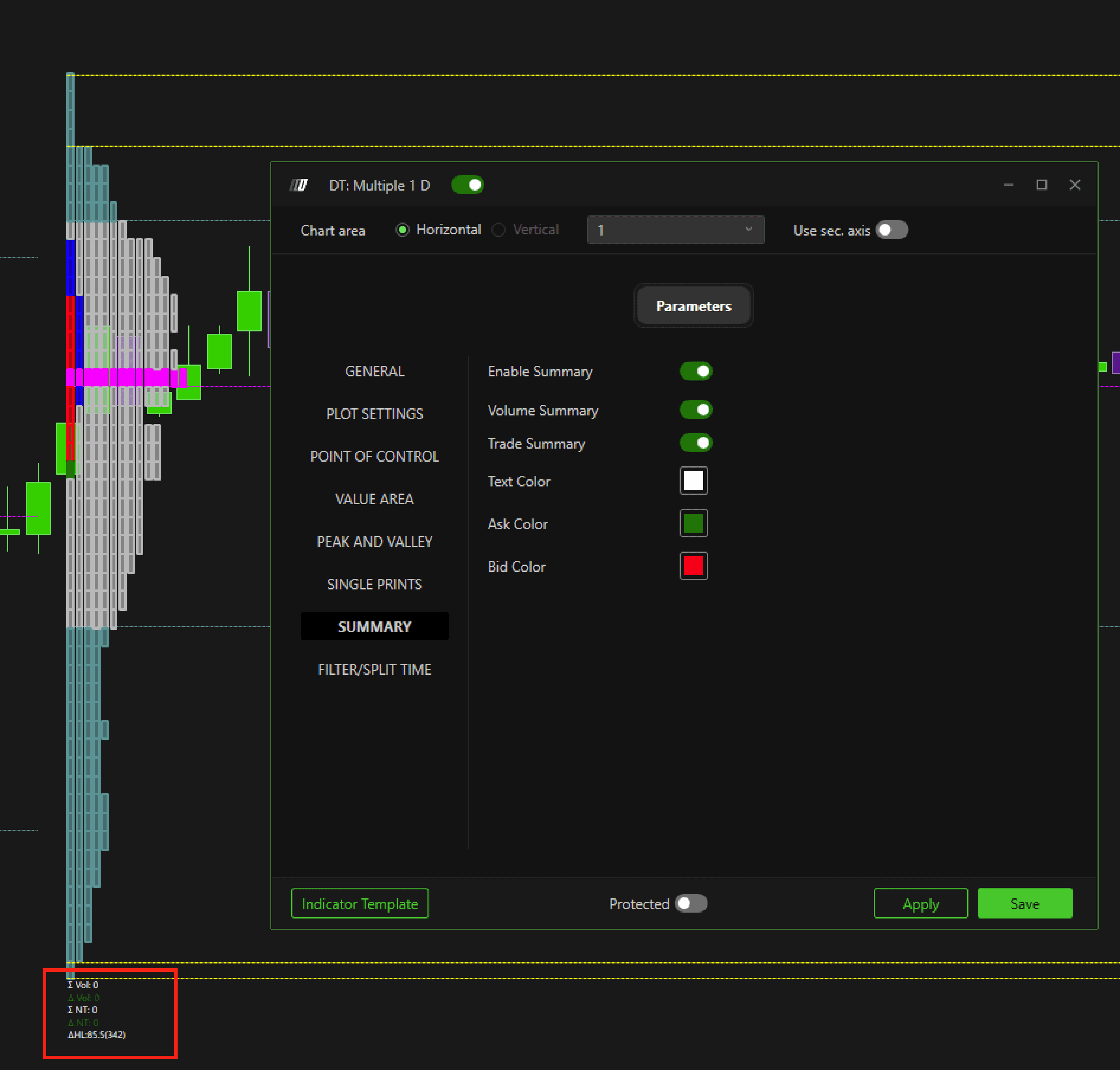 The Summary feature of the TPO allows you to view a detailed summary of the traded volume data for each profile on the chart. The summary shows information such as total volume, delta, number of trades, number of ticks, and other statistics related to market activity. This summary is useful for quickly understanding the key characteristics of the current TPO profile and previous profiles, facilitating analysis and comparison of different market sessions.