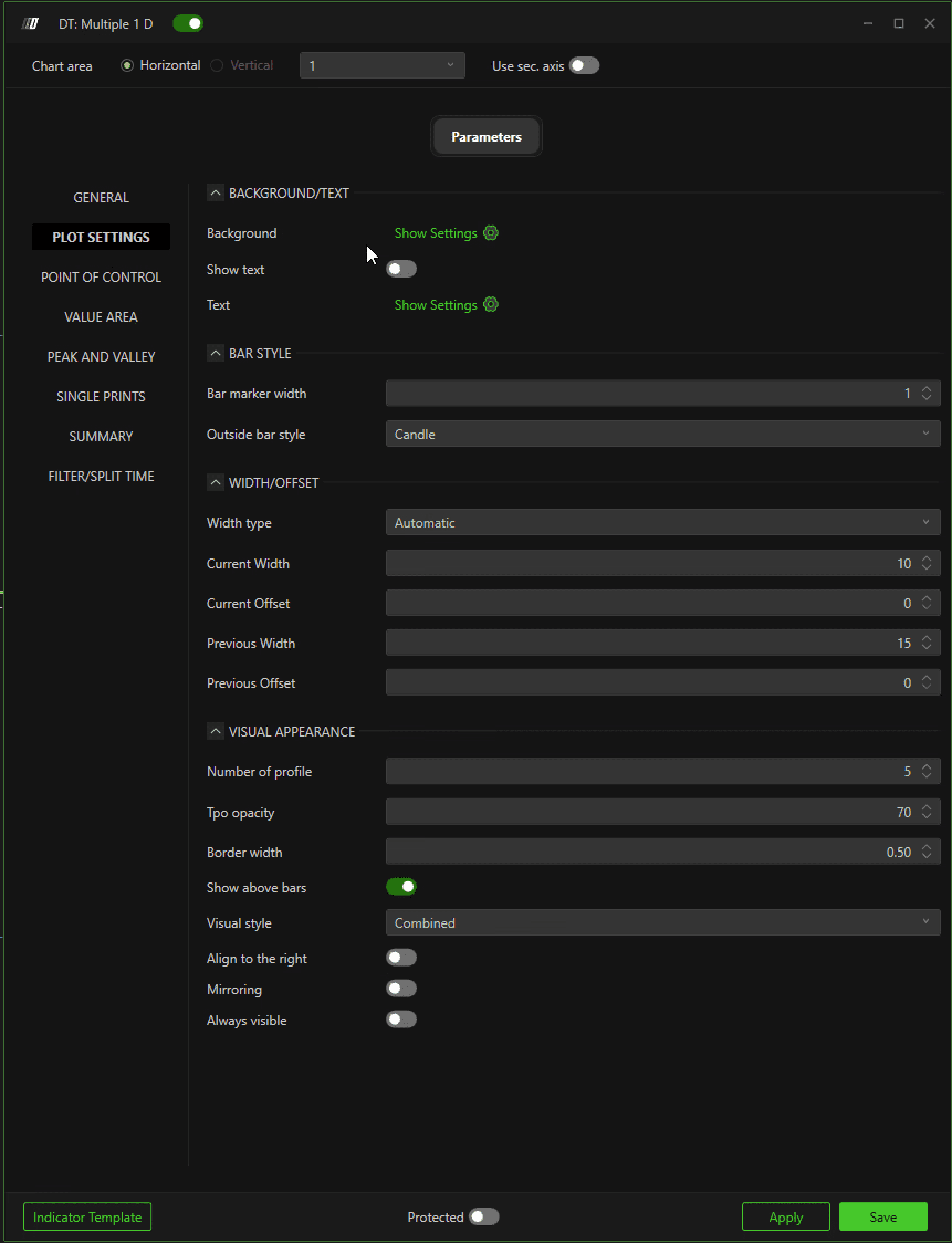 Split TPO: Allows the separation of the TPO into individual periods set on the Minute Base Type parameter, with different settings