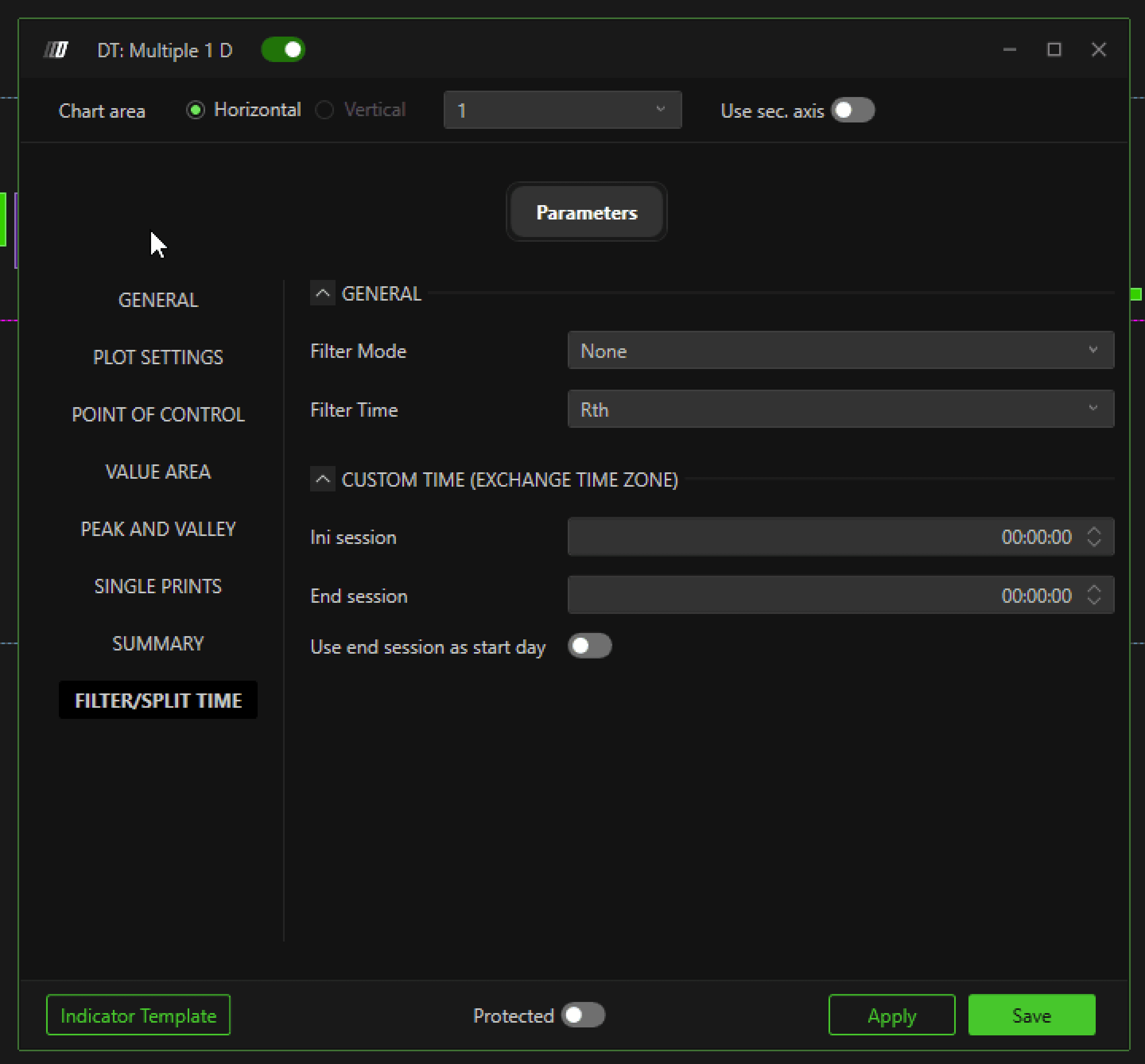 Filter Mode: It allows you to select the type of time filter to apply to the TPO. The filter option allows you to define a specific interval for profile analysis, isolating the desired period or dividing into multiple periods, e.g. ETH and RTH.