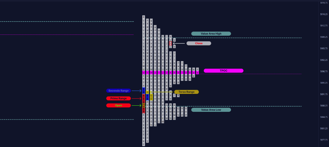 In TPO, the market is usually divided into 30-minute intervals, called "periods." Each period is represented by an alphabetical letter (from "A" to "Z"), in chronological order, representing the price evolution during the day. In a standard trading day, there can be up to 26 periods, but this number can vary depending on the length of the session or the financial instrument in question. Observing the TPO Profile in combination with the Volume Profile shows how price has distributed itself over time during the market session, thus providing a comprehensive view of market structure and supply and demand dynamics.