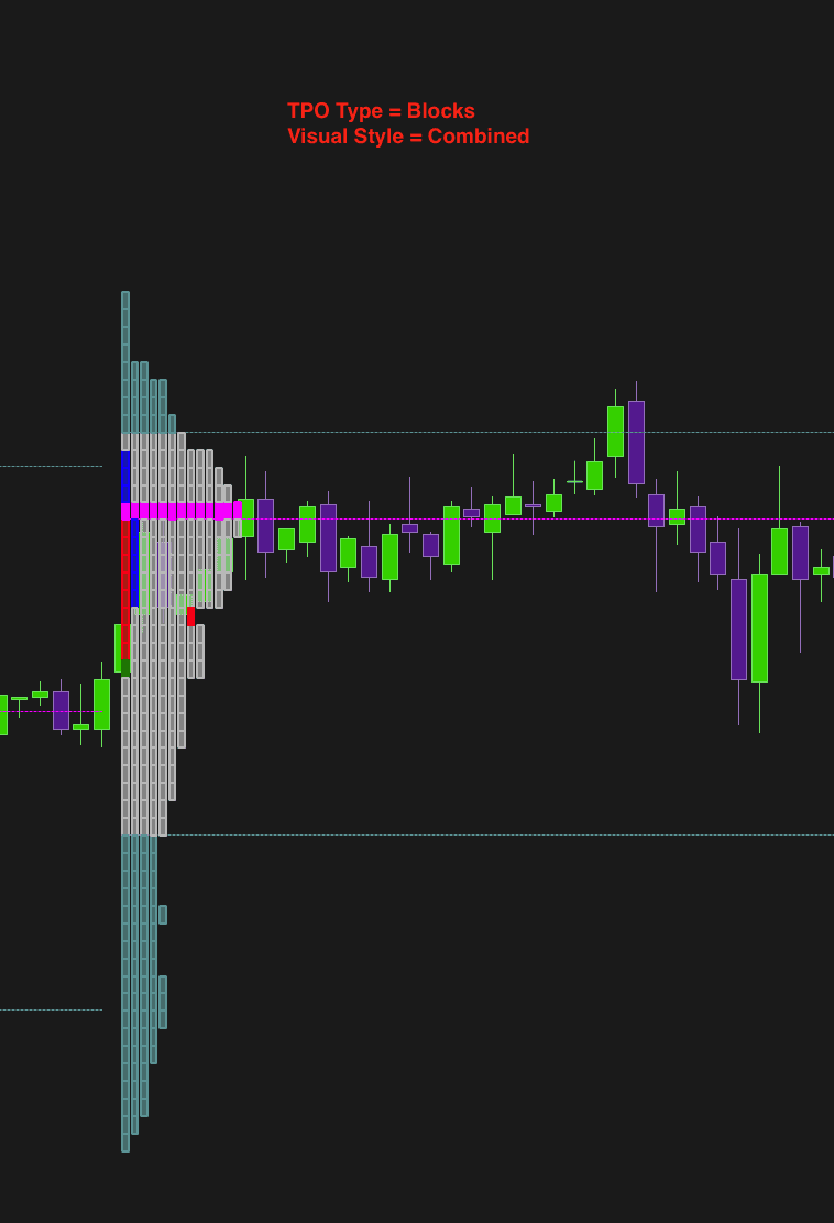 Splitted: Divides the TPO into separate sections, for example by morning and afternoon trading session. This mode allows the data to be analyzed separately for each part of the day, providing a more detailed view of the Time/Price distribution