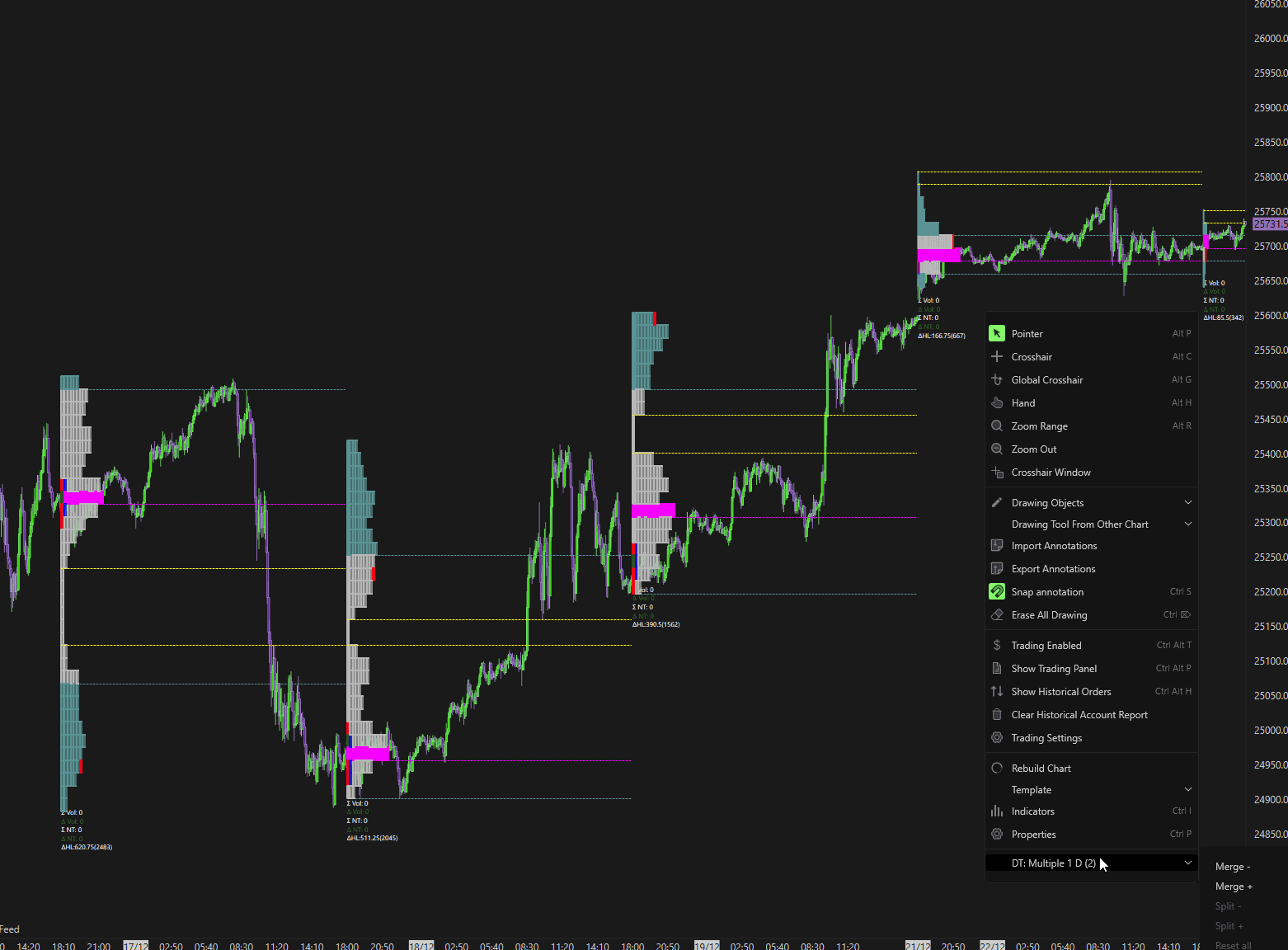 To access the Merge and Split functionality of the TPO, On the chart, Right-click on the Profile you want to merge and then on the TPO Menu item: Multiple