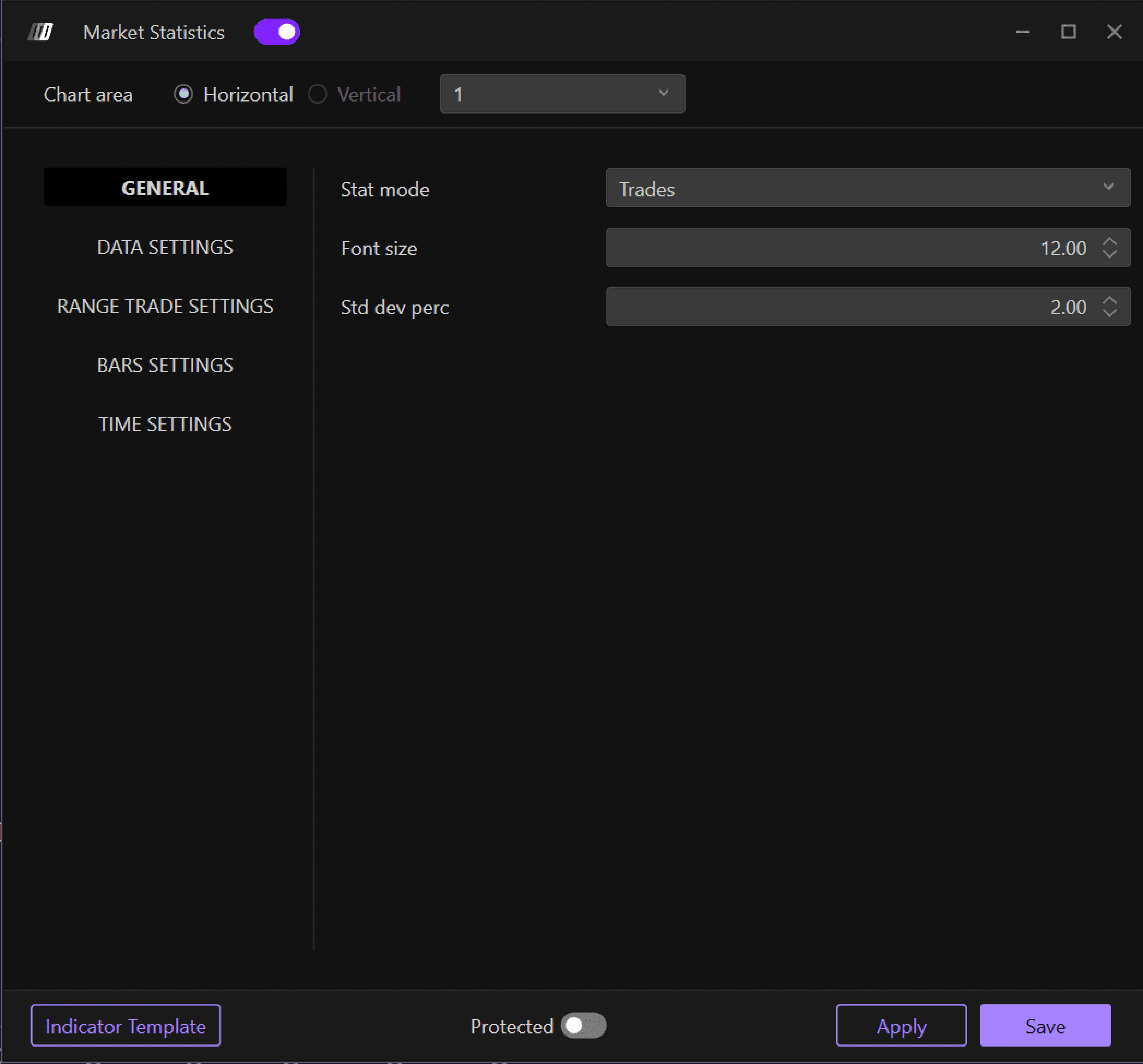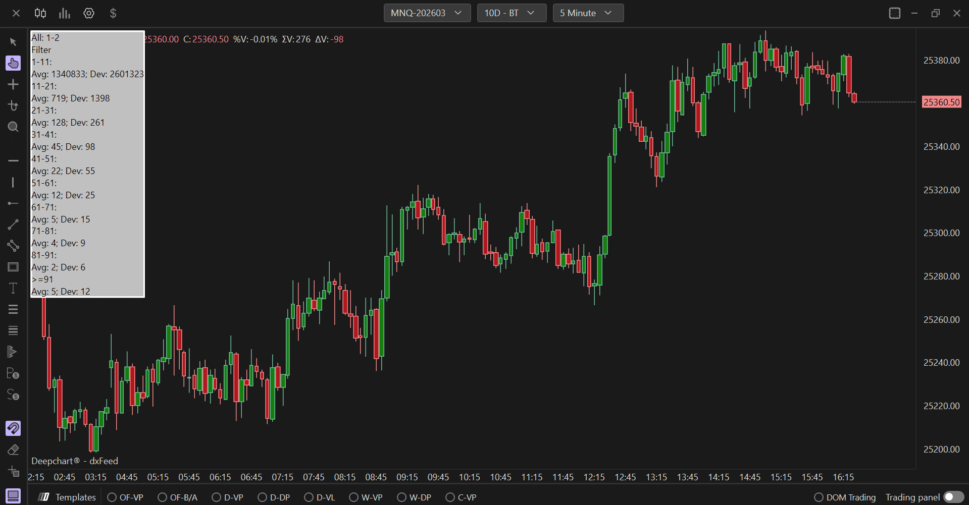 The Market Statistics indicator helps traders obtain useful statistical information to configure other tools such as Big Trades, Volume Clusters, Significant POCs, Delta Filter Bars, and Time & Sales. By analyzing the data loaded on the reference chart, it allows traders to identify the most frequent and least frequent values of a user-selected dataset, providing a useful statistical framework for determining meaningful levels and setting parameters for other indicators.