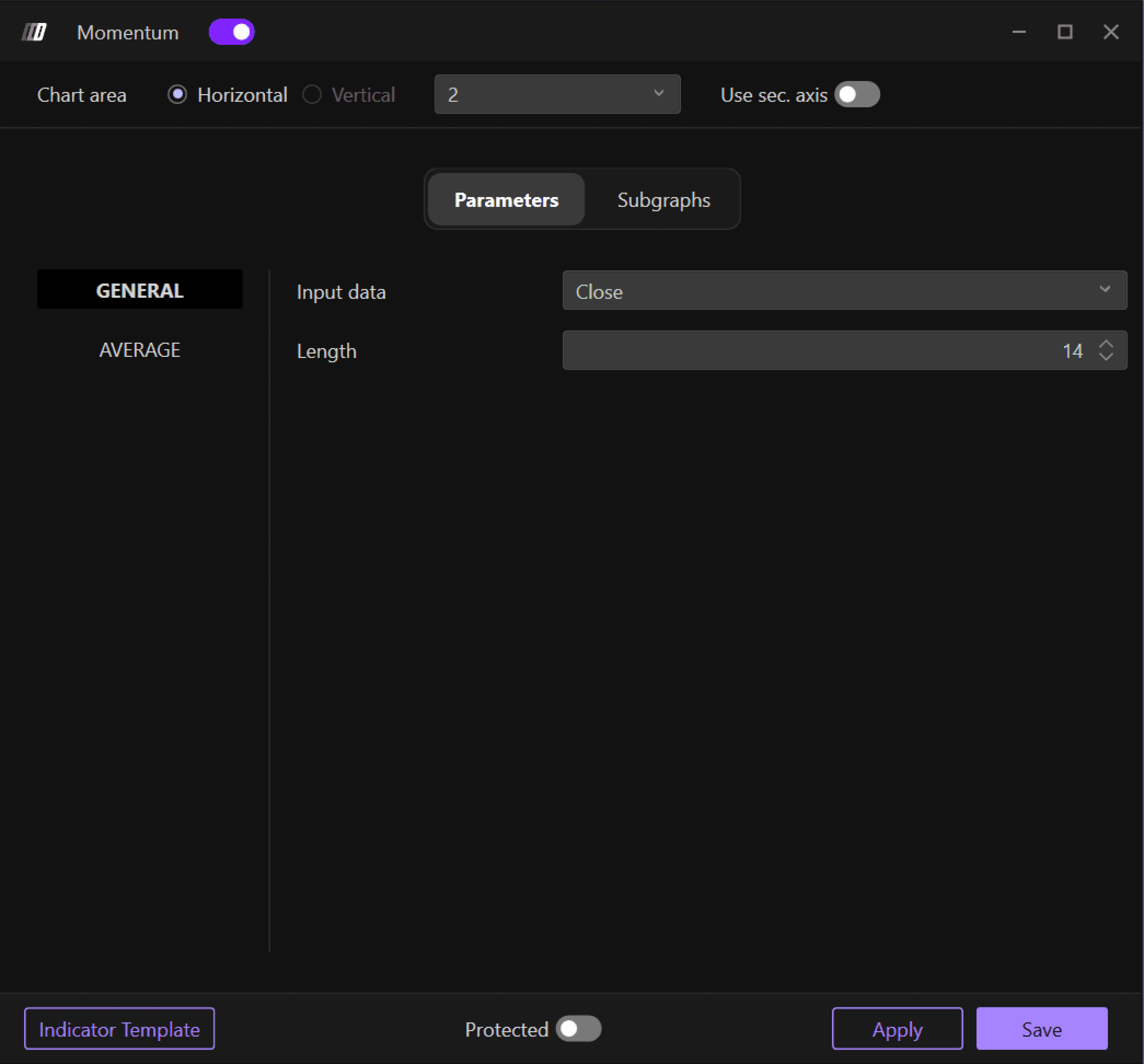 Length: The number of periods for momentum calculation (default: 14 periods)
