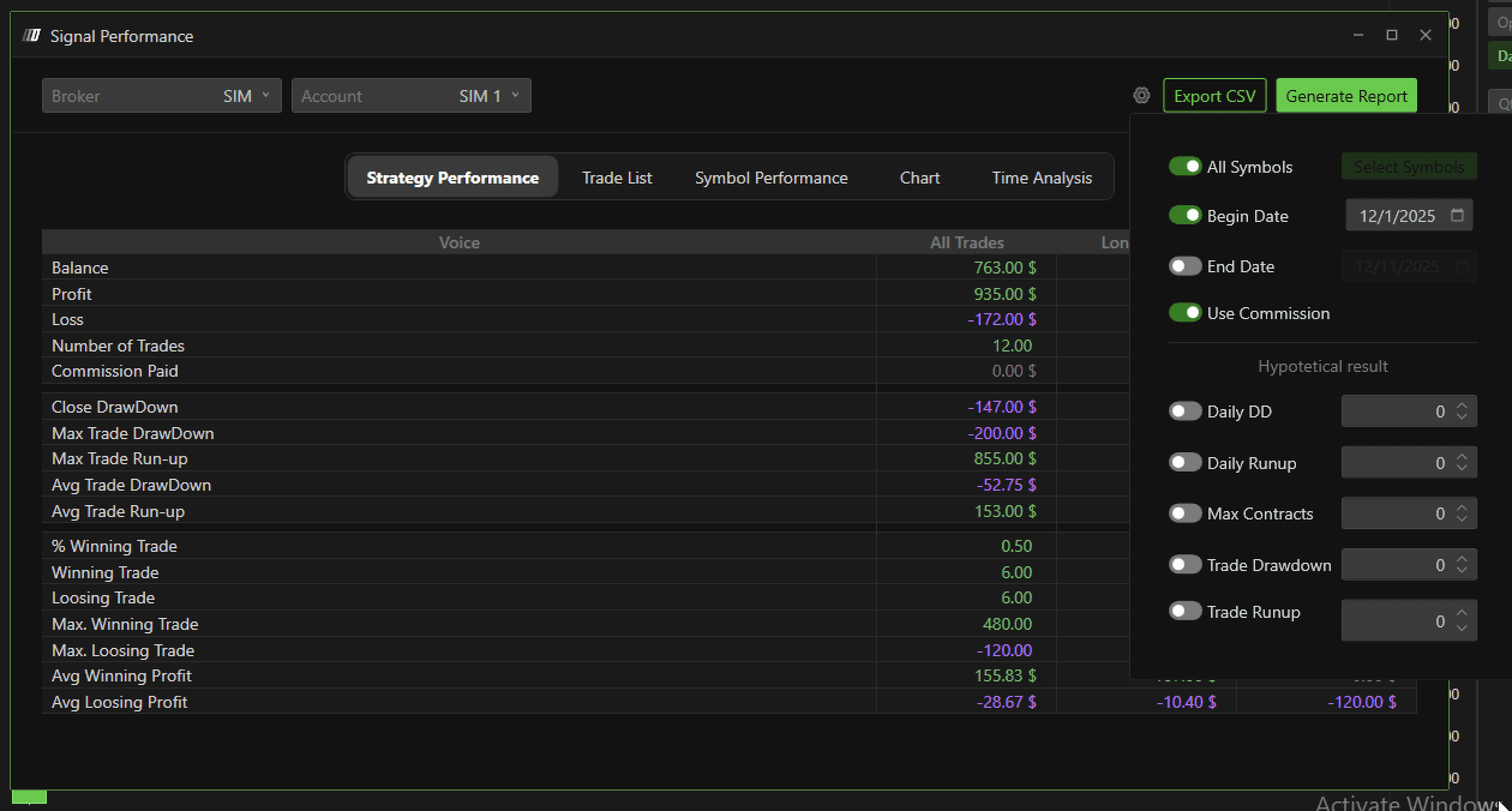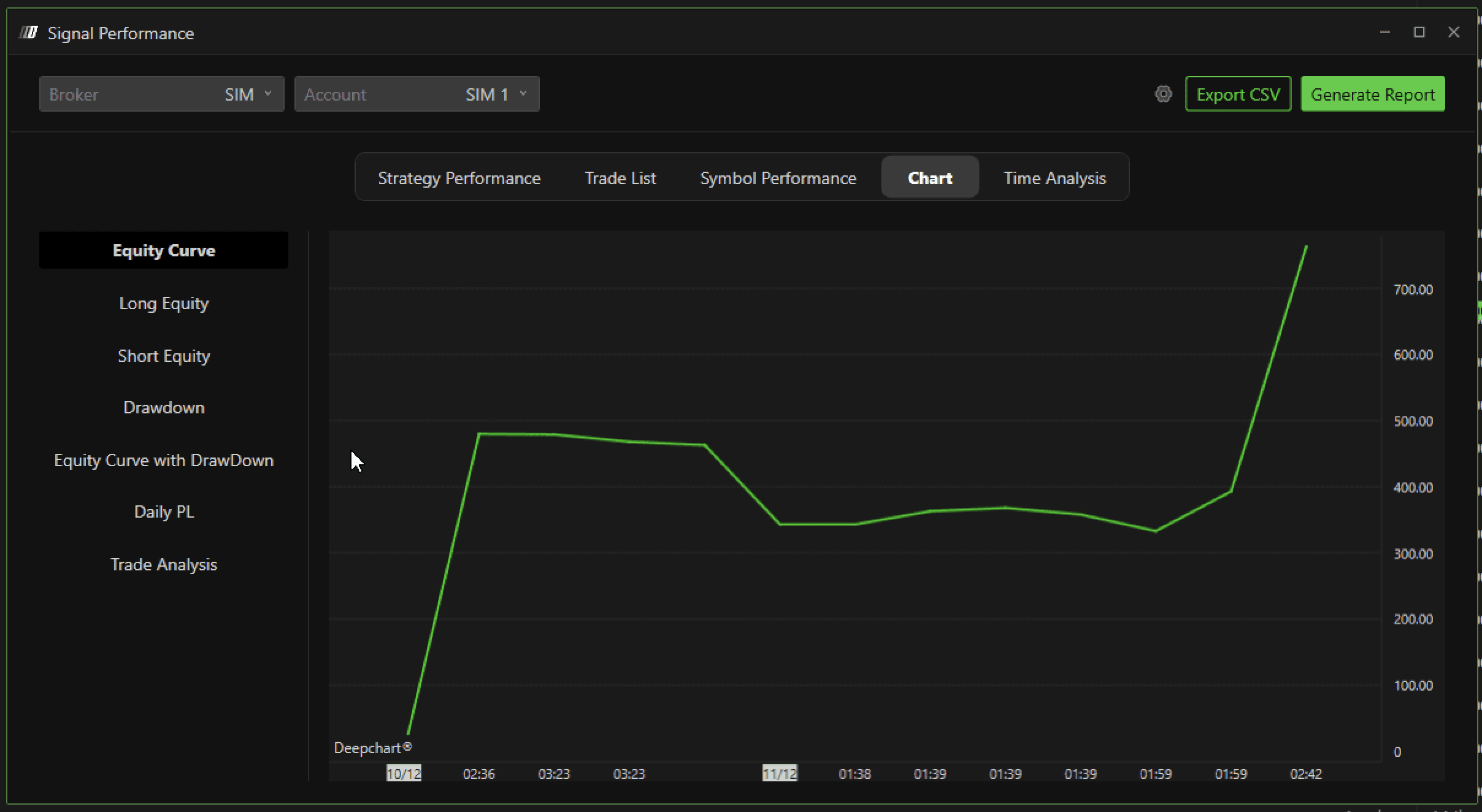 Click on the Trading menu in DeepChart and select Strategy Report.