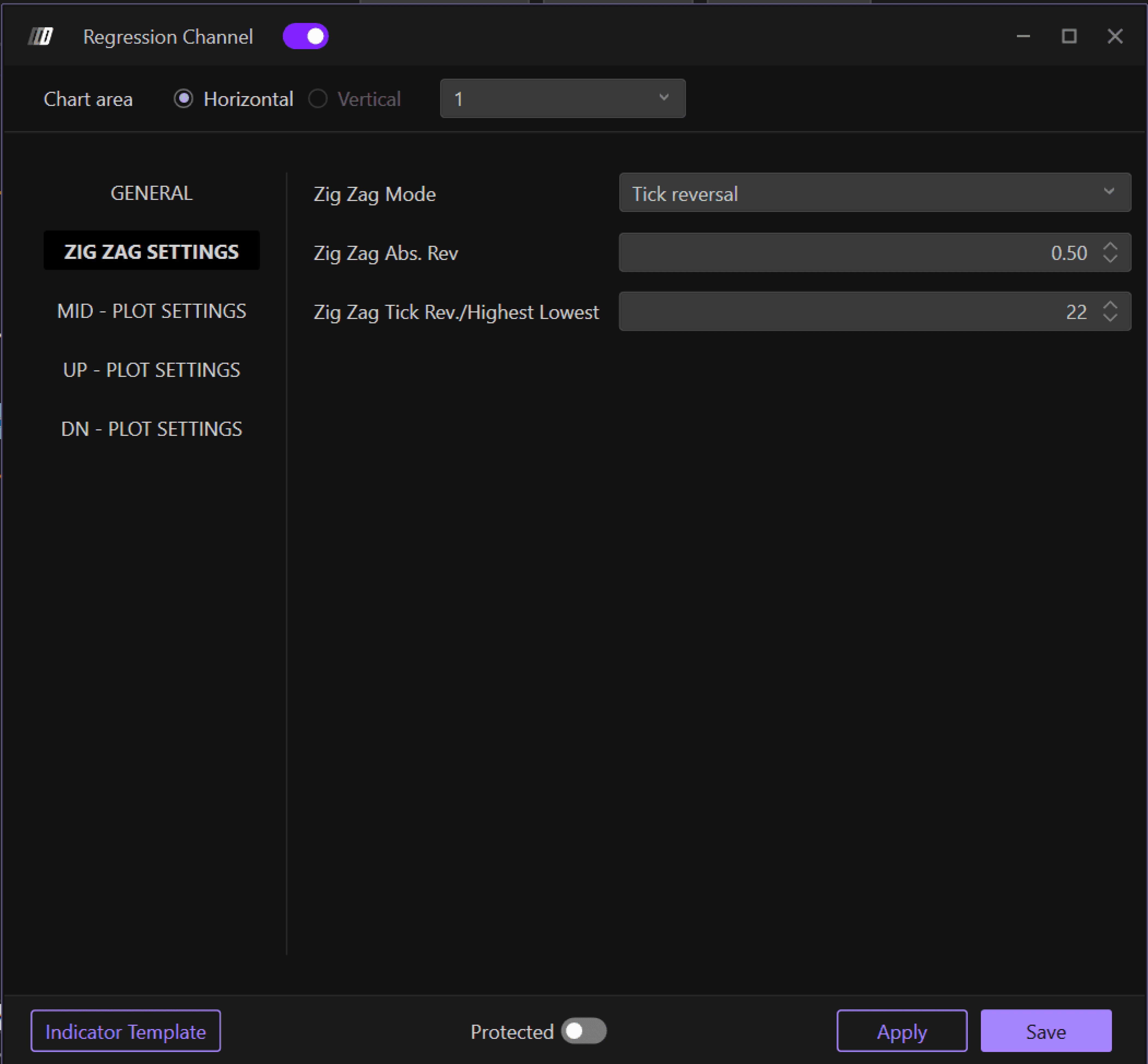 Zig Zag Tick Rev./Highest-Lowest: Set the reversal value (default: 22)