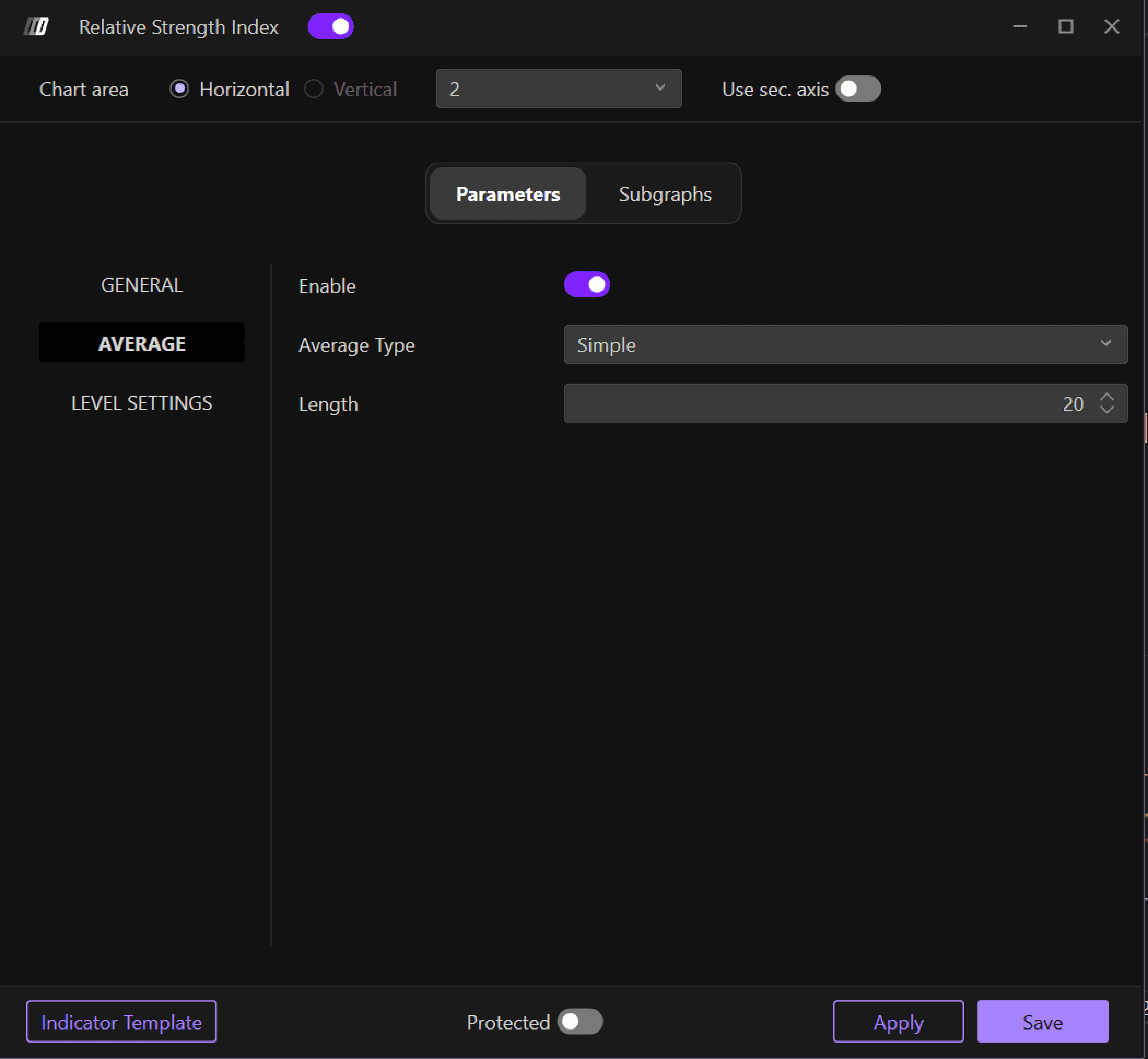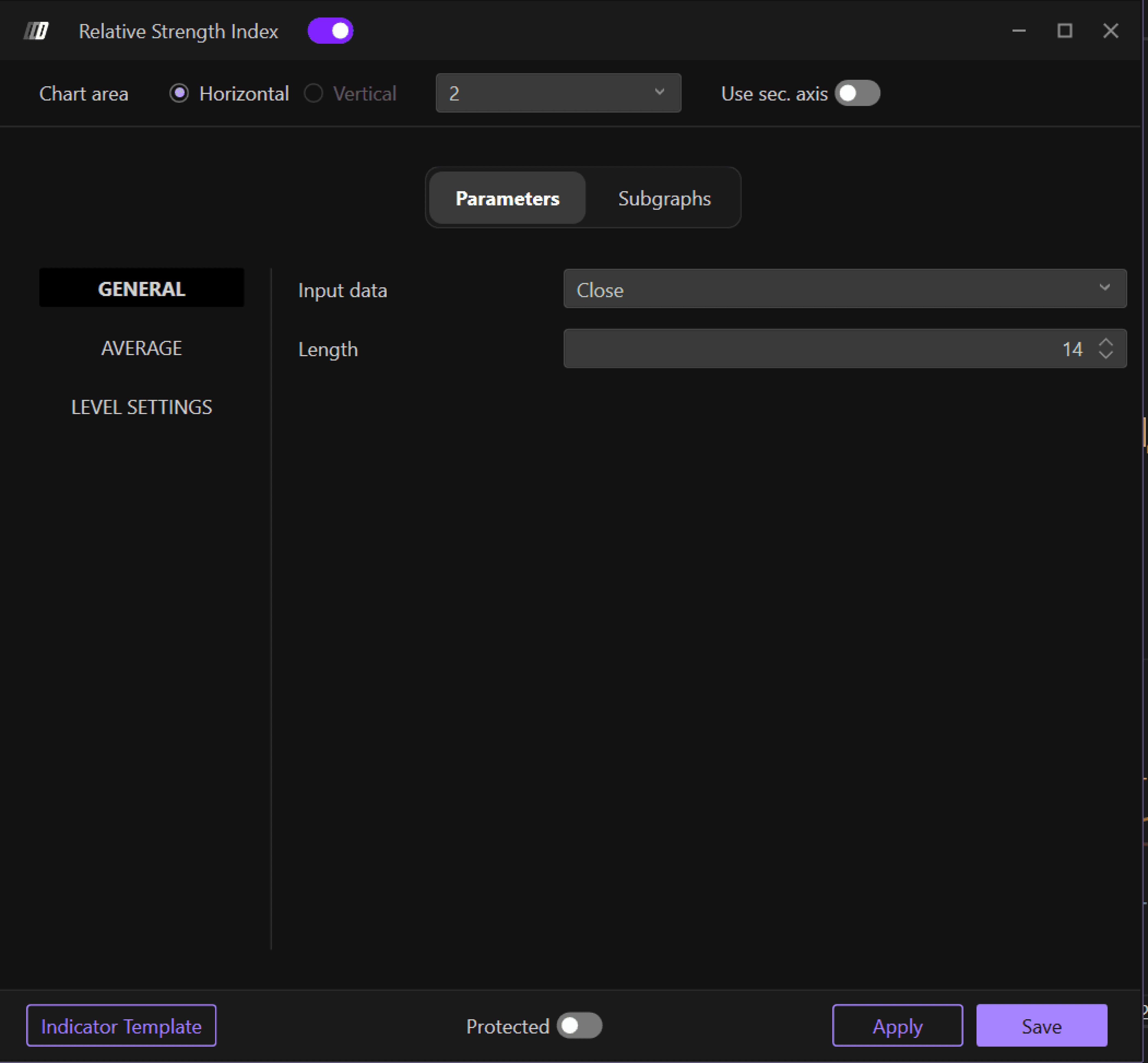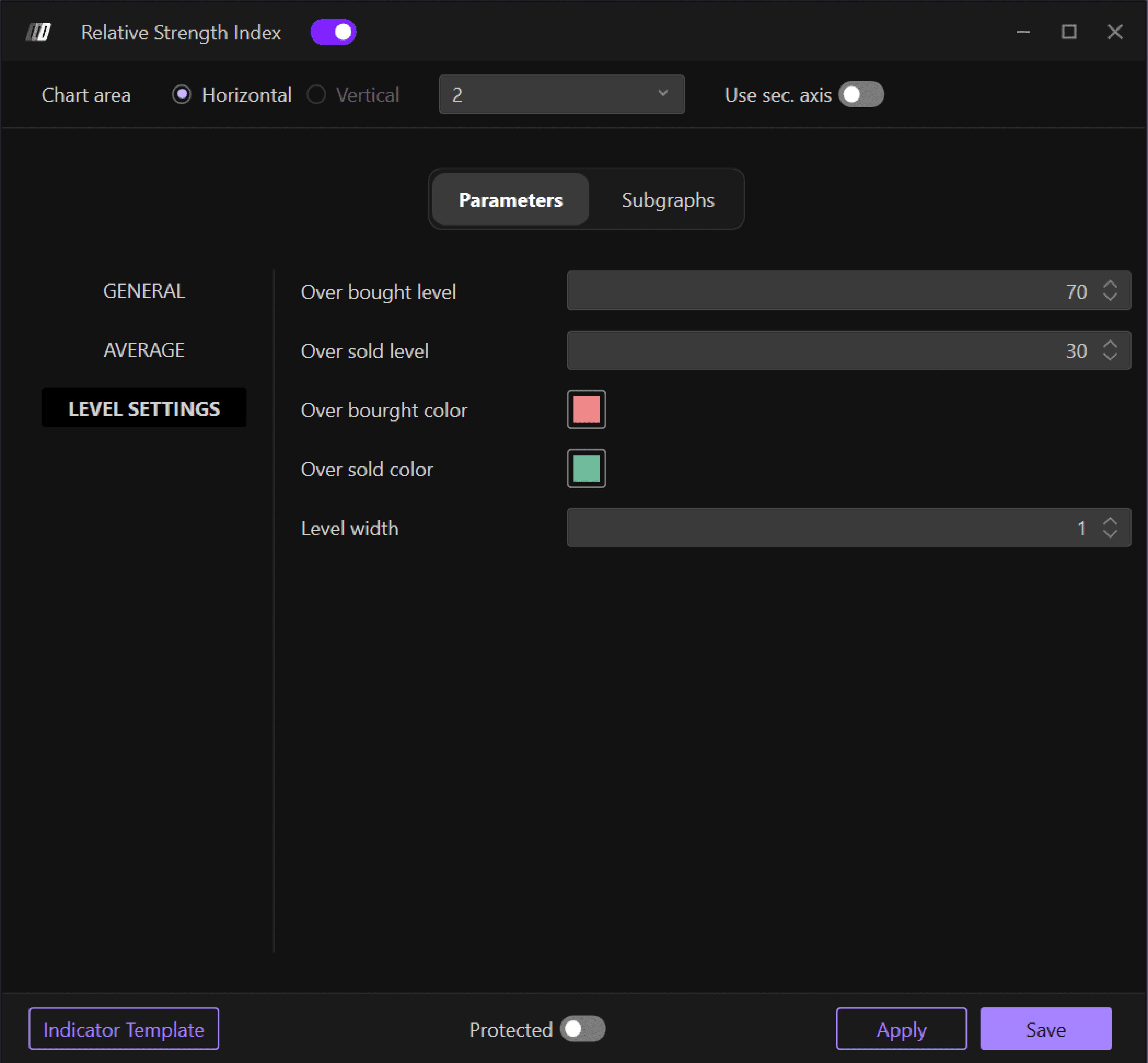 In the Subgraph section, you can change the colors and style of the RSI graph and its average: