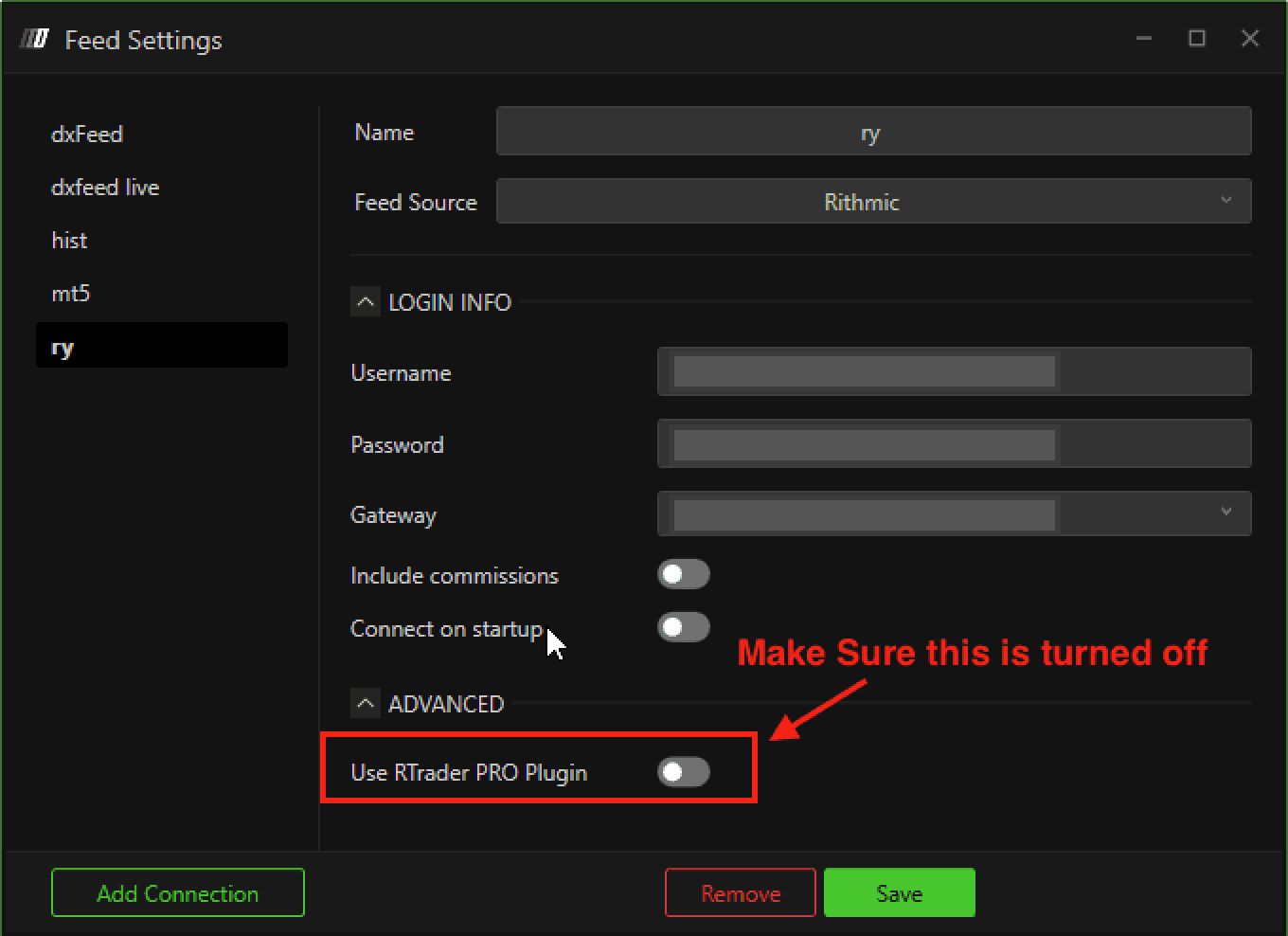 The option Use R|Trader is enabled in the Rithmic feed settings.