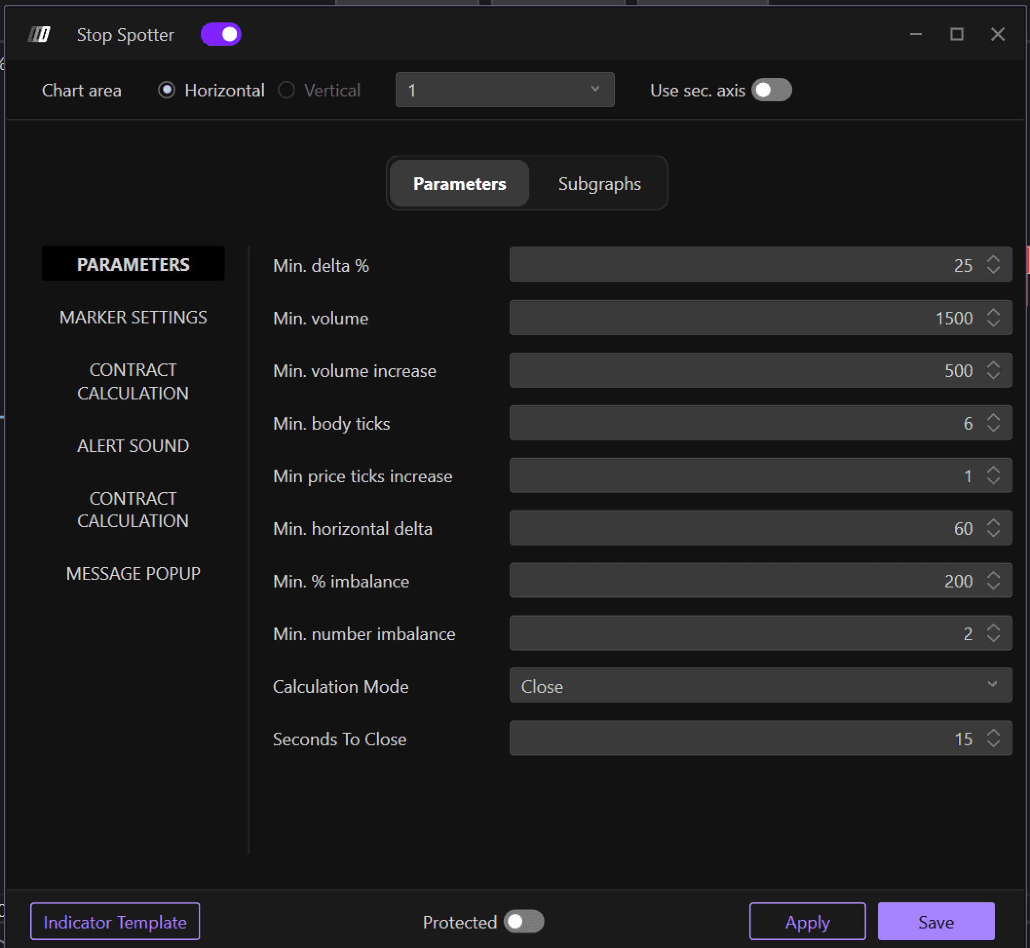 Sets the minimum horizontal delta threshold for stop-hunting detection. The default value is 60. Horizontal delta measures the difference between bid and ask volume at specific price levels, helping identify areas where aggressive buying or selling is taking place.